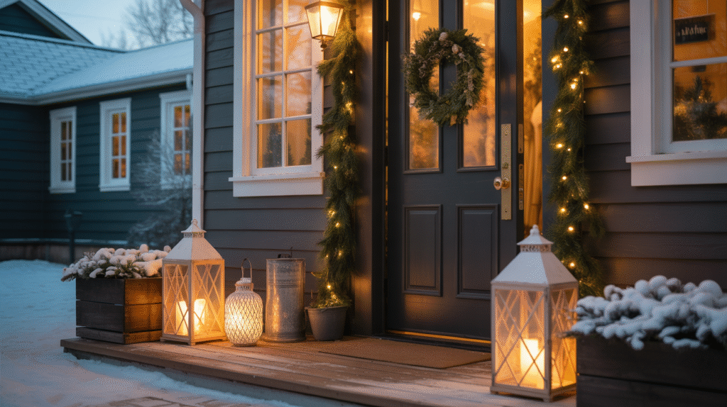 Lanterns bring a soft, welcoming glow to your entryway, making them a perfect addition to your Christmas Entryway Decor. Placing lanterns on both sides of your door—or styling them in clusters—creates an inviting ambiance that instantly sets a festive tone. Their warm light enhances the comfort and charm of your front entrance, especially during evening gatherings.