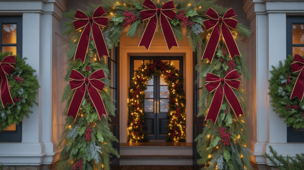 Large decorative bows add an instant pop of color and charm to your entryway. Whether tied onto railings, planters, lanterns, or even your front door, these eye-catching accents bring a cheerful and polished look to your Christmas Entryway Decor. Their bold appearance helps draw attention to architectural features while adding a playful holiday touch.