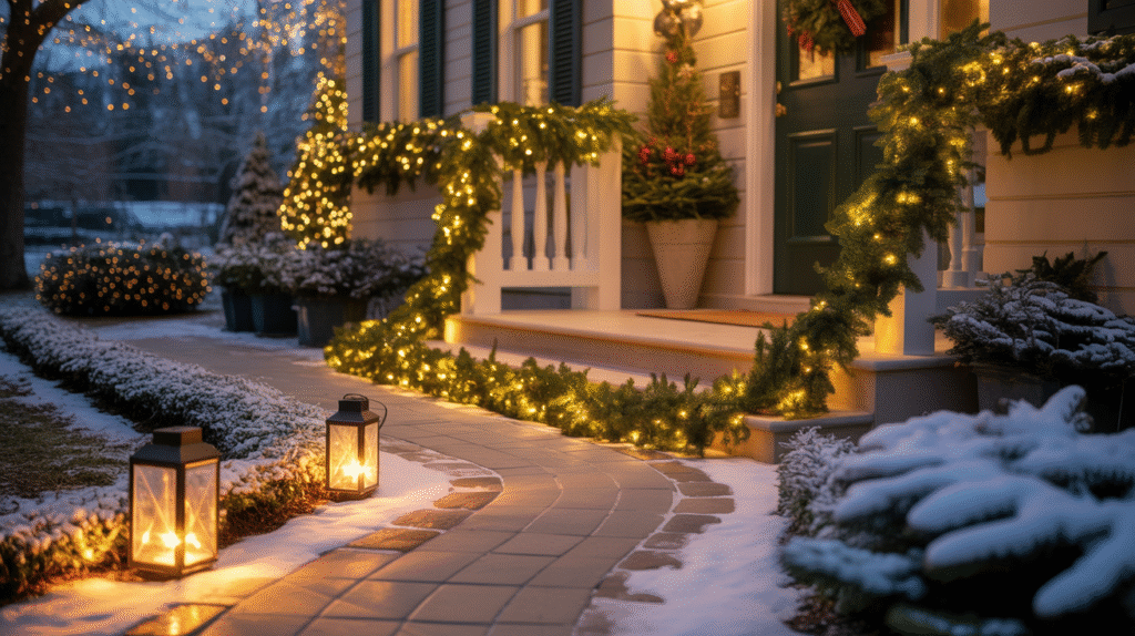 You can choose warm white lights for a classic holiday feel or opt for subtle golden tones to create a magical winter ambiance. Arranging lights along your walkway or around your porch steps adds depth, structure, and a sense of celebration. These small touches make evenings feel cozy and full of holiday charm.