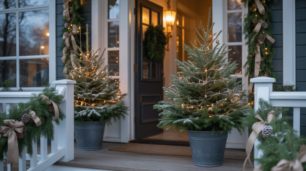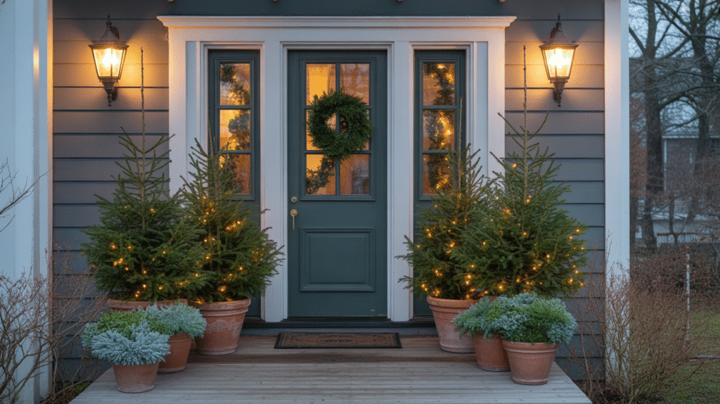 Incorporating potted evergreen trees into your Christmas Entryway Decor complements other elements like holiday greenery styling, winter porch arrangements, and festive entry landscaping. This natural, elegant feature adds warmth and beauty, welcoming guests with a cozy, forest-inspired holiday vibe.