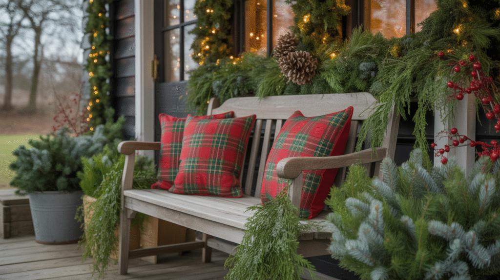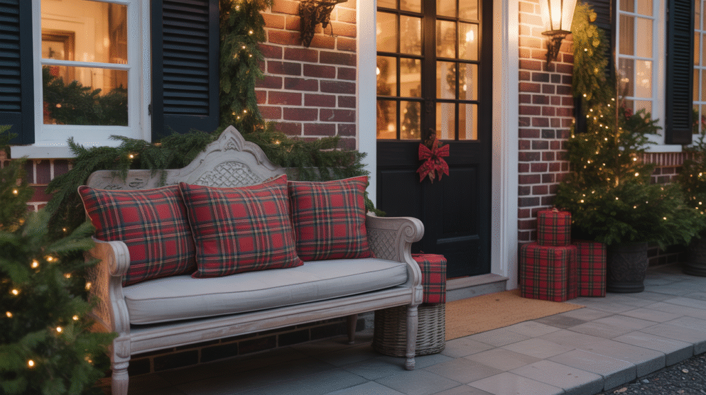 Including a seasonal bench display in your Christmas Entryway Decor blends beautifully with holiday porch styling, winter entry accessories, and festive front-door décor. This charming touch adds depth and personality, creating a cozy outdoor moment that makes guests feel instantly welcomed.