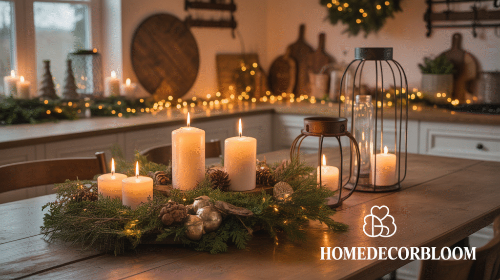 Soft, warm lighting is essential for creating a cozy and inviting Christmas Kitchen and Dining Inspiration in a rustic farmhouse setting. Lanterns, pillar candles, and tea lights placed along the table or kitchen counters provide gentle illumination that highlights natural textures and festive décor. This ambient glow enhances the warmth of wood tones, greenery, and vintage accents, making your space feel magical and welcoming.