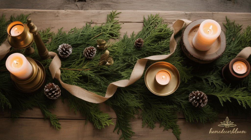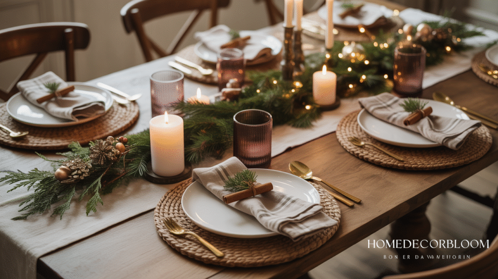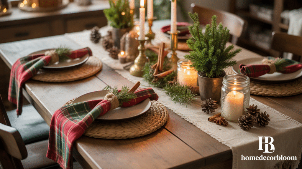 Mixing textures like wood, metal, and greenery adds depth and visual interest. Incorporating candles—whether in glass jars, lanterns, or rustic holders—introduces soft ambient light, enhancing the cozy, farmhouse charm. This combination creates a holiday dining ambiance that feels inviting, warm, and thoughtfully styled without being overly elaborate.