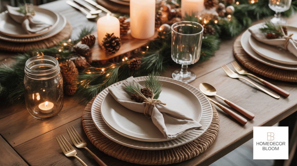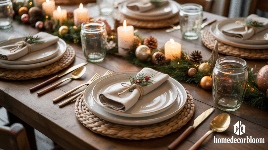 Glassware and cutlery should complement the rustic theme—think mason jar glasses, wooden-handled utensils, or vintage silverware. These subtle details help bring together the holiday dining décor and ensure that each place setting feels cohesive and inviting. Adding small festive accents such as pinecones, mini ornaments, or dried fruit enhances the holiday ambiance without overwhelming the table.