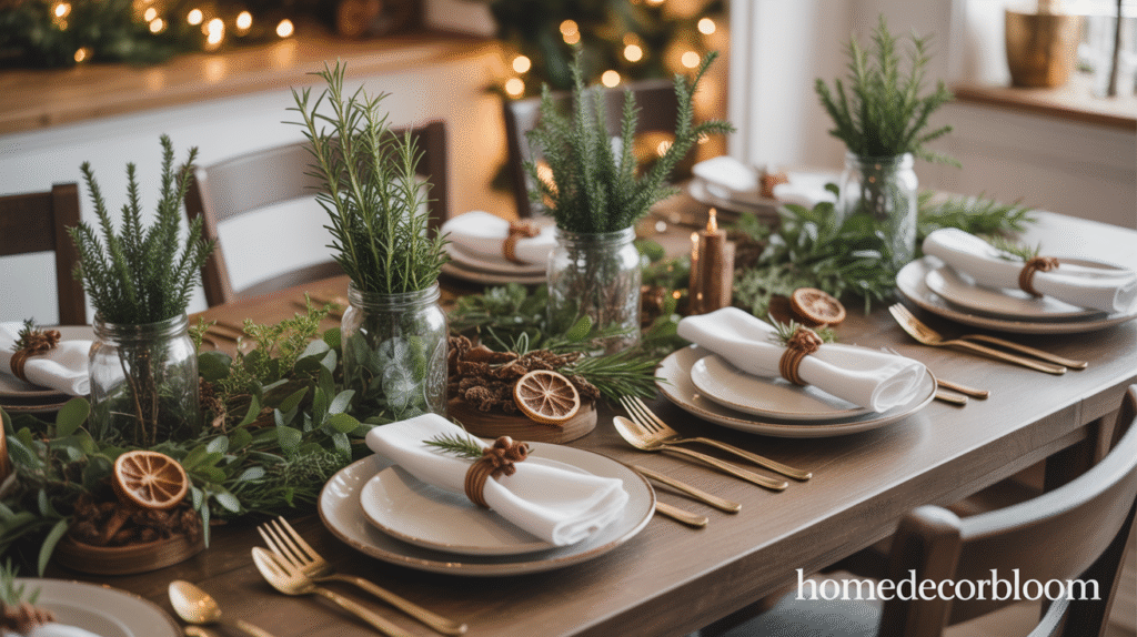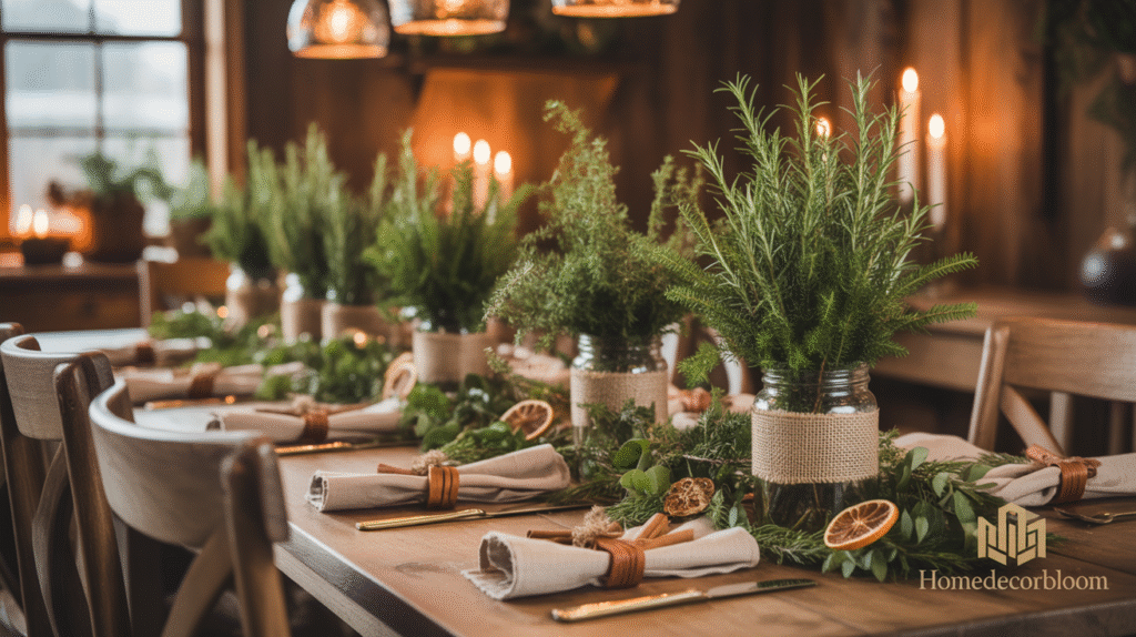 For a cohesive look, coordinate greenery and herb accents with your table settings, linens, and lighting. This approach ensures that your farmhouse Christmas dining inspiration feels thoughtfully styled, natural, and inviting. The combination of fresh greenery and rustic accents creates a warm and festive atmosphere that guests will love.