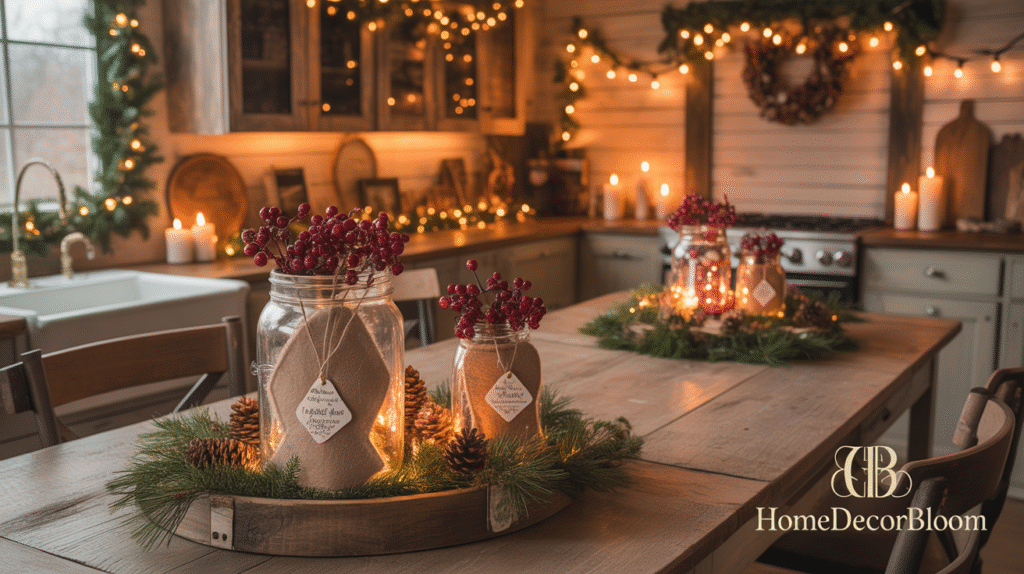 For a personal touch, include small ornaments, dried oranges, or handmade decorations to complement the natural elements. A well-crafted rustic centerpiece ties together all aspects of your farmhouse Christmas kitchen décor, serving as the focal point of the table while exemplifying Christmas Kitchen and Dining Inspiration for a warm and festive holiday setting.