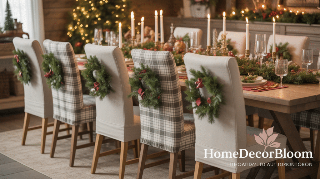 Styling chairs is the final touch to complete your Christmas Kitchen and Dining Inspiration with a rustic farmhouse feel. Adding subtle accents like plaid or linen chair covers, cozy throws, ribbons, or small evergreen wreaths brings the festive theme vertically into your space and enhances the overall warmth. These details help your dining area feel intentional, inviting, and perfectly coordinated with the table décor.