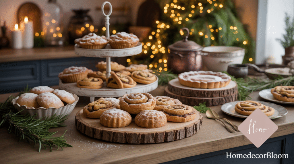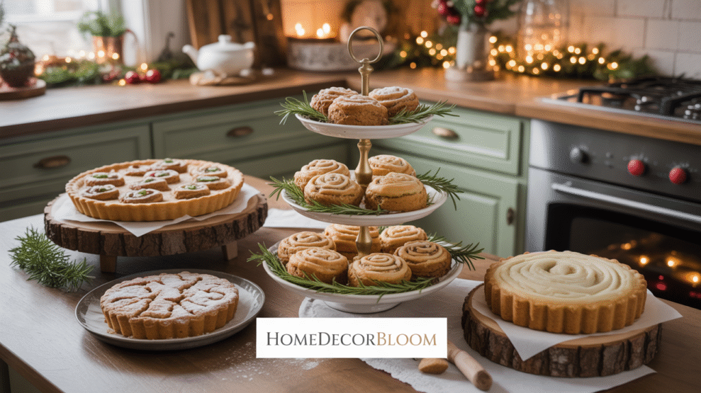 Incorporate natural accents such as sprigs of rosemary, powdered sugar “snow,” or small ornaments around the baked goods to tie them seamlessly into your holiday kitchen décor. Using rustic trays, enamel plates, or vintage serving dishes complements the farmhouse aesthetic and highlights the charm of homemade treats.