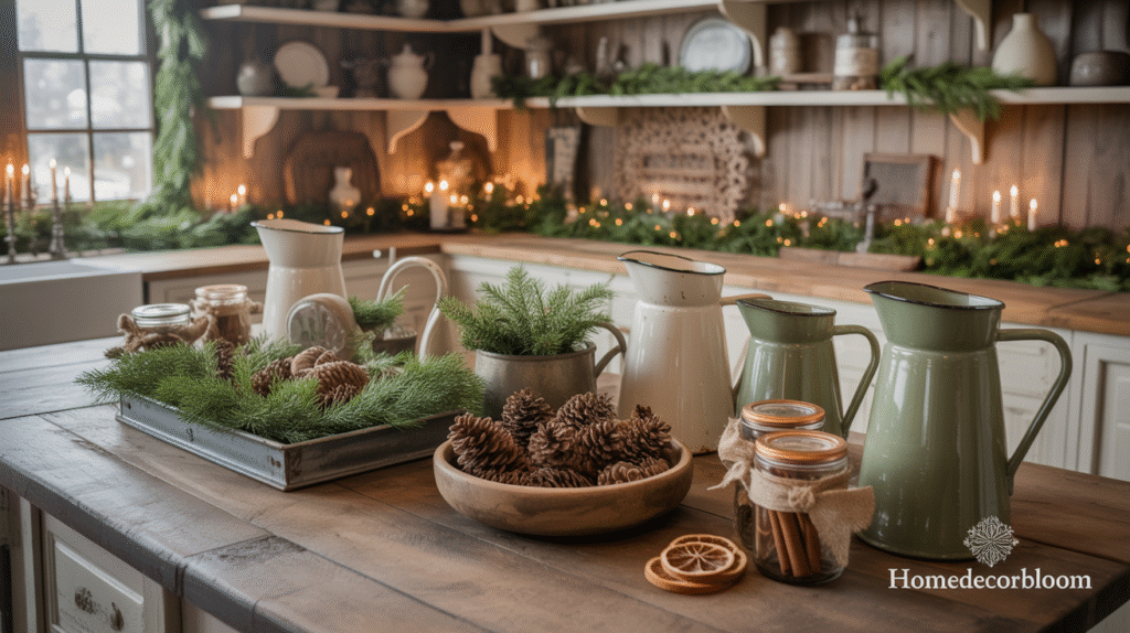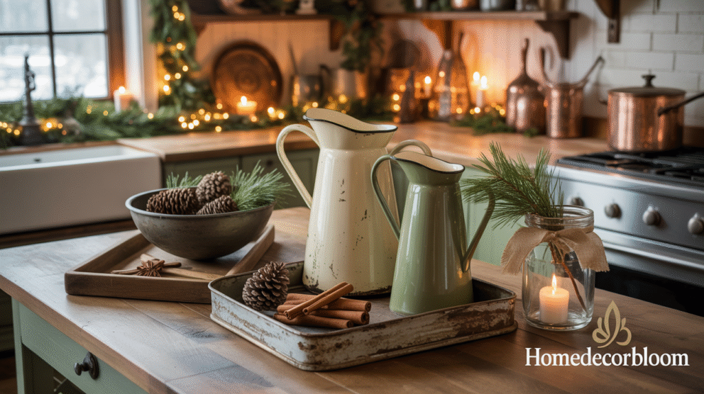 Pairing vintage accessories with natural elements like greenery, pinecones, or cinnamon sticks creates a balanced, timeless look. Simple touches such as a tiered tray with seasonal treats, a wooden cutting board styled with oranges and spices, or a rustic bread basket can elevate the holiday kitchen décor while keeping the space warm and inviting. These layered details bring depth and personality to your farmhouse-inspired setting.