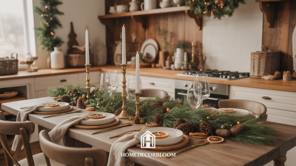 To enhance the farmhouse feel, layer in natural elements such as evergreen branches, pinecones, dried oranges, and burlap ribbons. These materials introduce organic beauty while complementing the warm wood tones. When paired with simple white ceramics or vintage glass jars, the entire space takes on a charming, nostalgic vibe—perfect for rustic holiday kitchen décor and farmhouse Christmas dining styling.