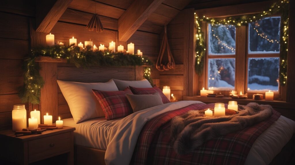 Nothing completes a cozy Christmas bedroom like the soft flicker of candlelight and the comforting aroma of the holidays. Choose candles scented with pine, cinnamon, vanilla, or spiced orange to fill the room with warmth and nostalgia. The gentle glow creates a calming ambiance, perfect for winding down on a cold winter night.