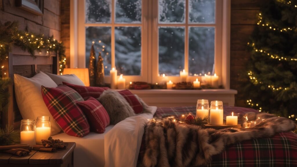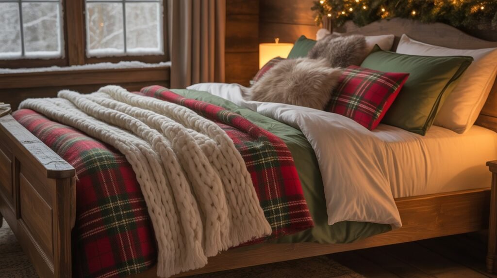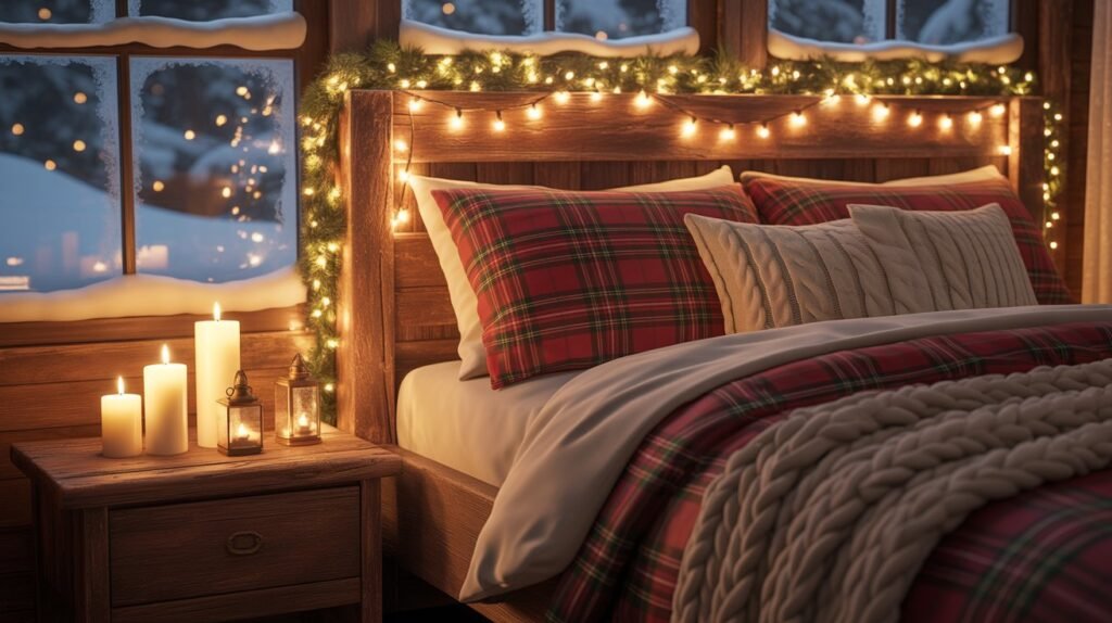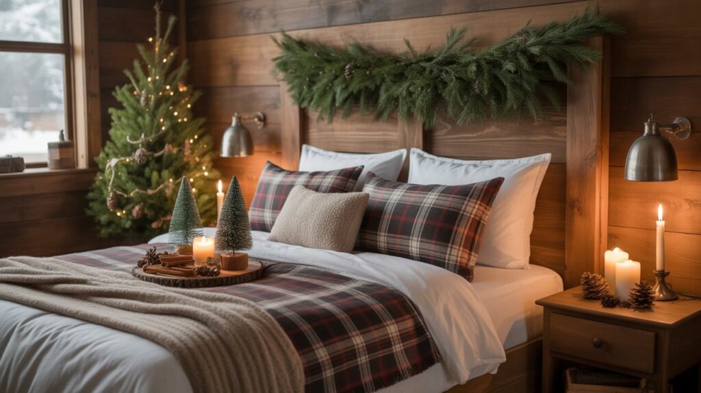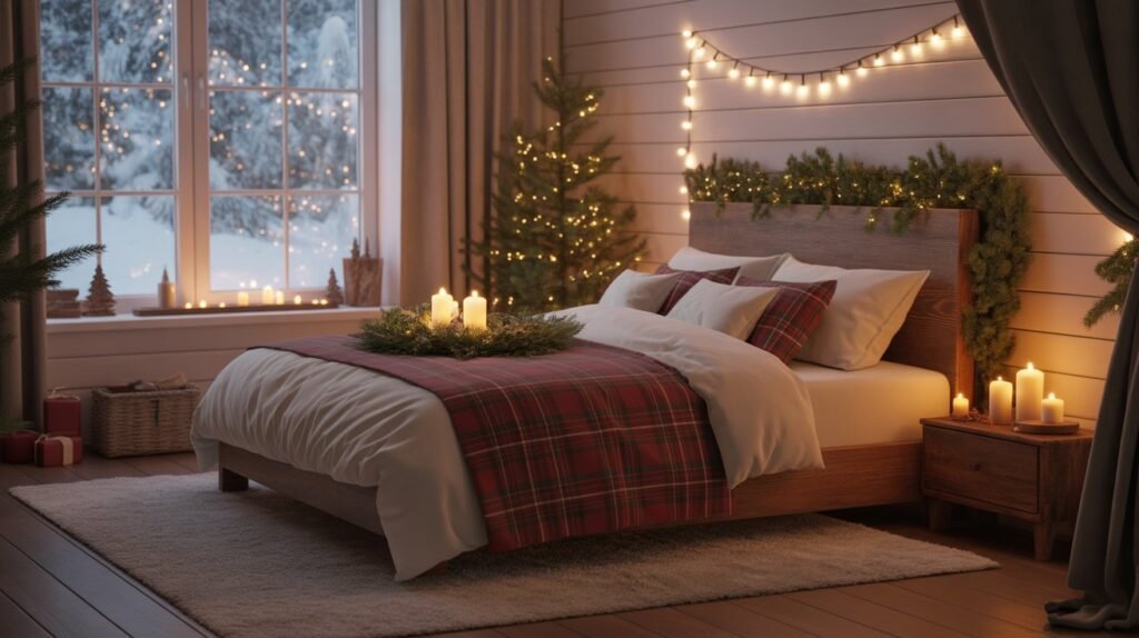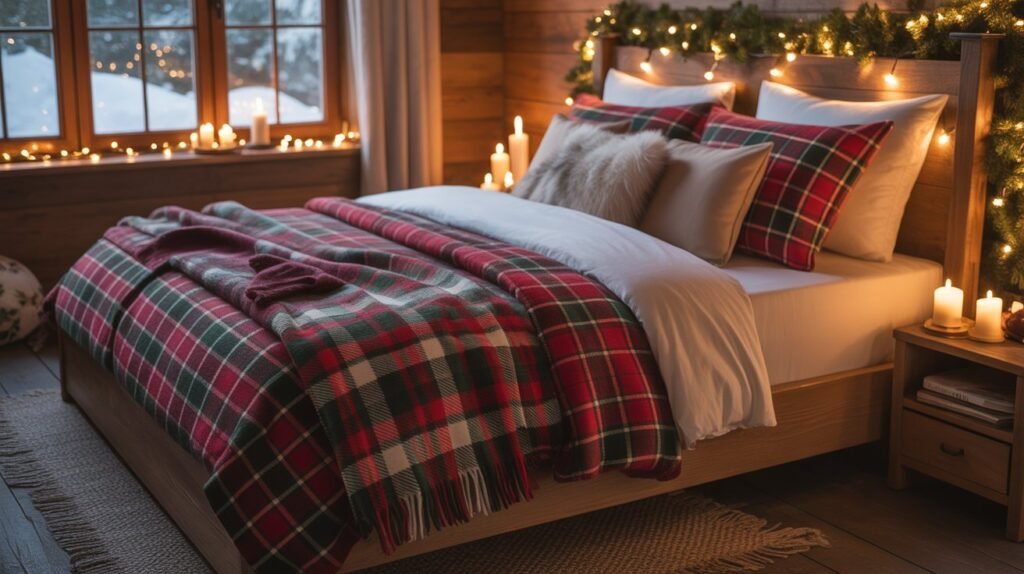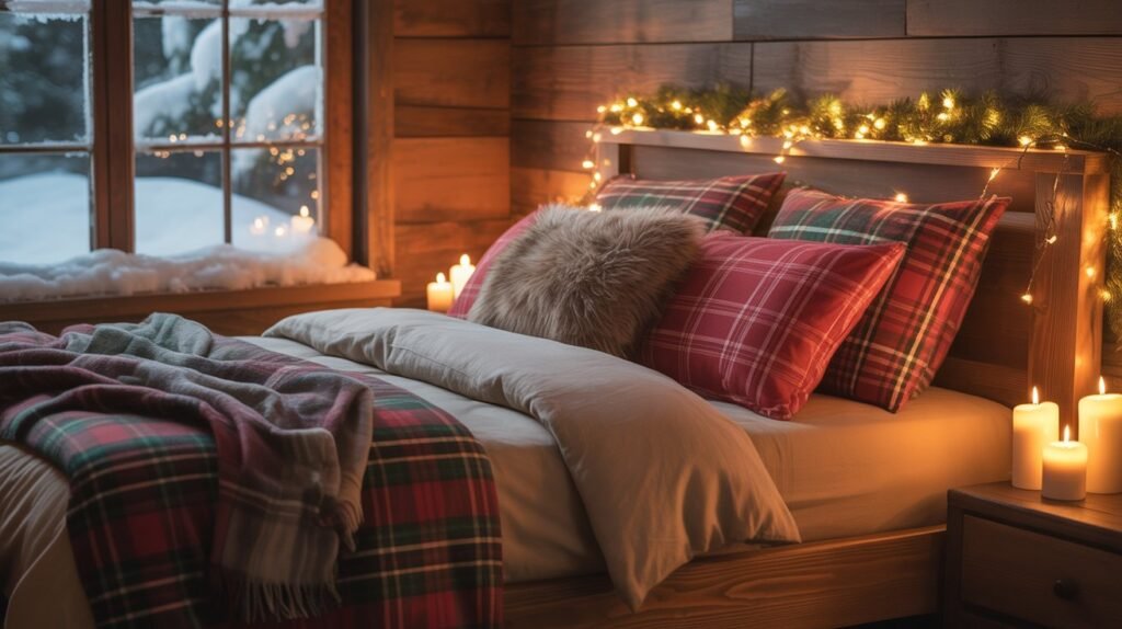 Red and green plaids bring a traditional Christmas vibe, while black-and-white or muted gray tones offer a more modern rustic appeal. Balance these patterns with solid neutral linens and soft textures like faux fur or wool to prevent the look from feeling too busy. These subtle festive touches make your bedroom both stylish and snug for winter nights.