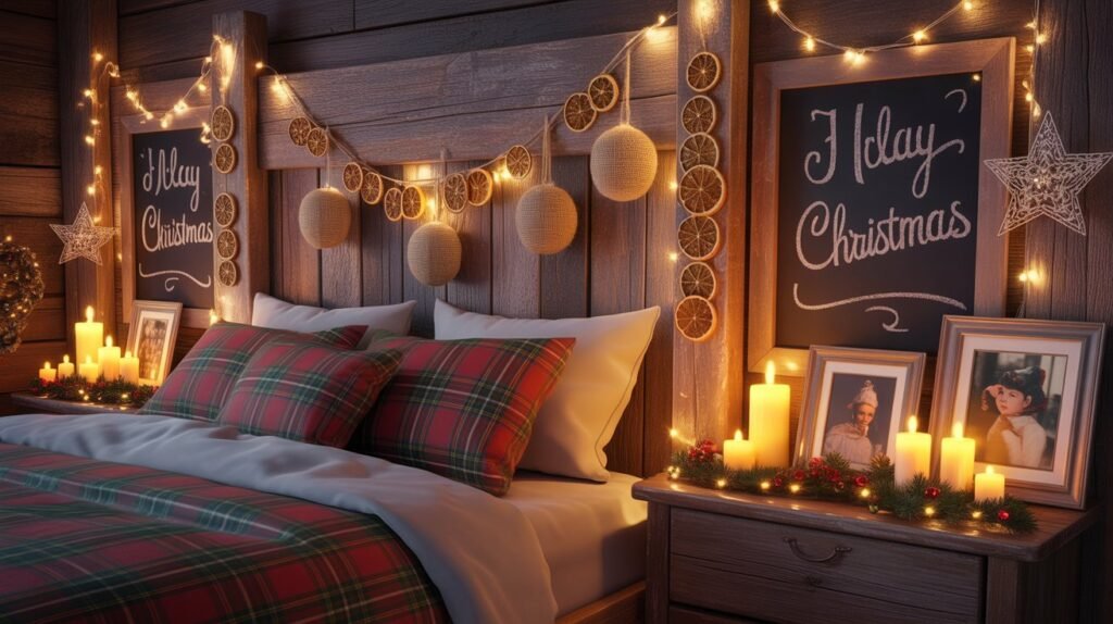You can also display framed holiday photos, handwritten notes, or a small chalkboard with a festive message beside your bed. These simple details make the space uniquely yours, adding layers of warmth and sentiment that no store-bought décor can replace.