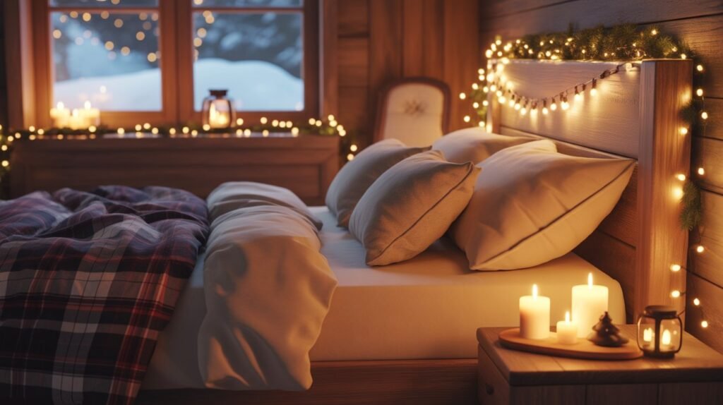 Lighting sets the mood in any bedroom, and during the holidays, it’s all about creating that gentle, golden glow. Drape warm fairy lights around your headboard, hang small lanterns in the corners, or place candles on your nightstand for a soft, flickering ambiance that feels dreamy and festive.