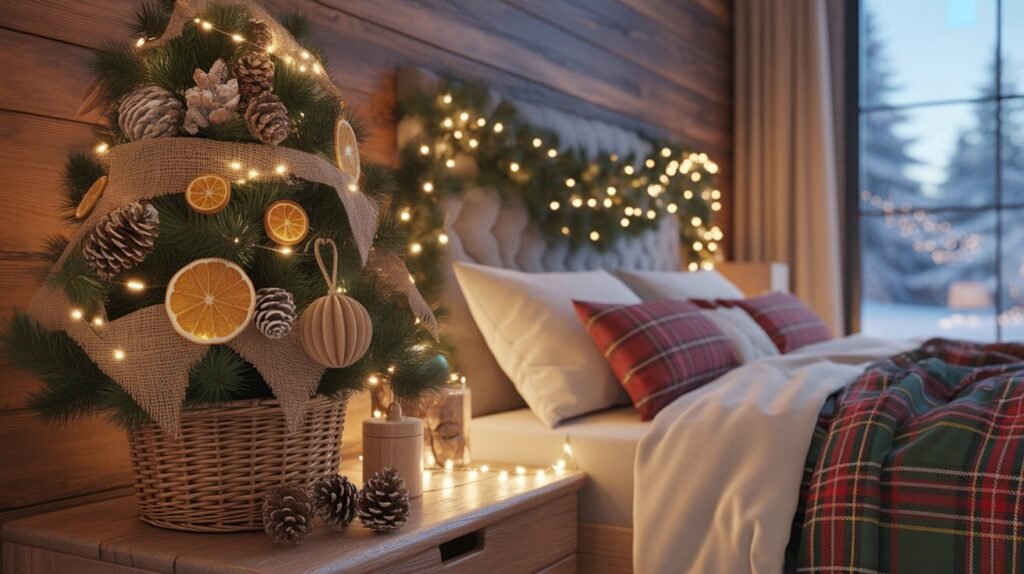 Bringing a Christmas tree into the bedroom—whether full-sized or miniature—instantly transforms the space into a festive retreat. A small tree placed in a woven basket, galvanized tub, or wooden crate fits perfectly into the rustic theme. Choose natural decorations like wooden ornaments, dried orange slices, cinnamon sticks, and burlap ribbons to maintain that cozy, farmhouse look.