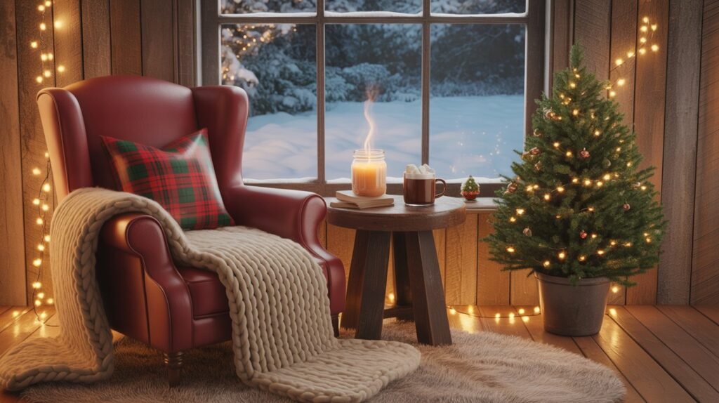 Add a small side table with a candle, a cup of tea, or a tiny potted evergreen for an extra festive touch. Soft lighting—perhaps from a nearby lantern or a string of fairy lights—enhances the calm, inviting mood. This little retreat within your bedroom not only elevates comfort but also becomes a perfect space to enjoy quiet holiday moments.