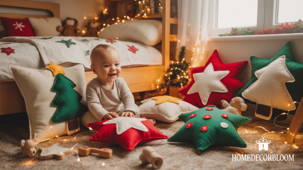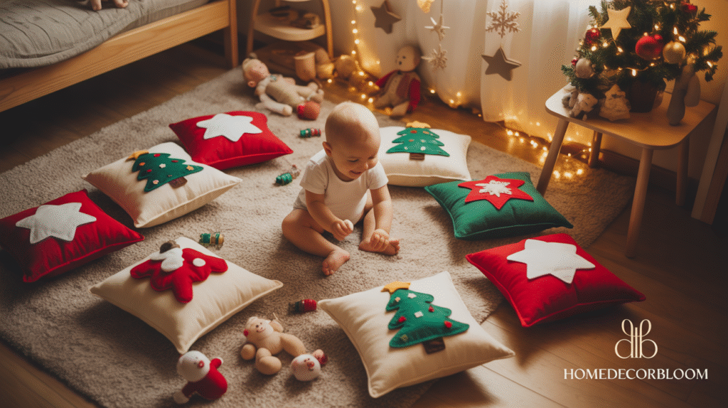 Handmade cushion covers are a fun and affordable way to enhance your Christmas Decorations For Kids. Kids love soft, colorful elements in their room, and festive cushions instantly make the space feel cozier and more playful. With a few inexpensive fabrics—like felt, old T-shirts, or leftover cloth—you can create adorable Christmas-themed covers.