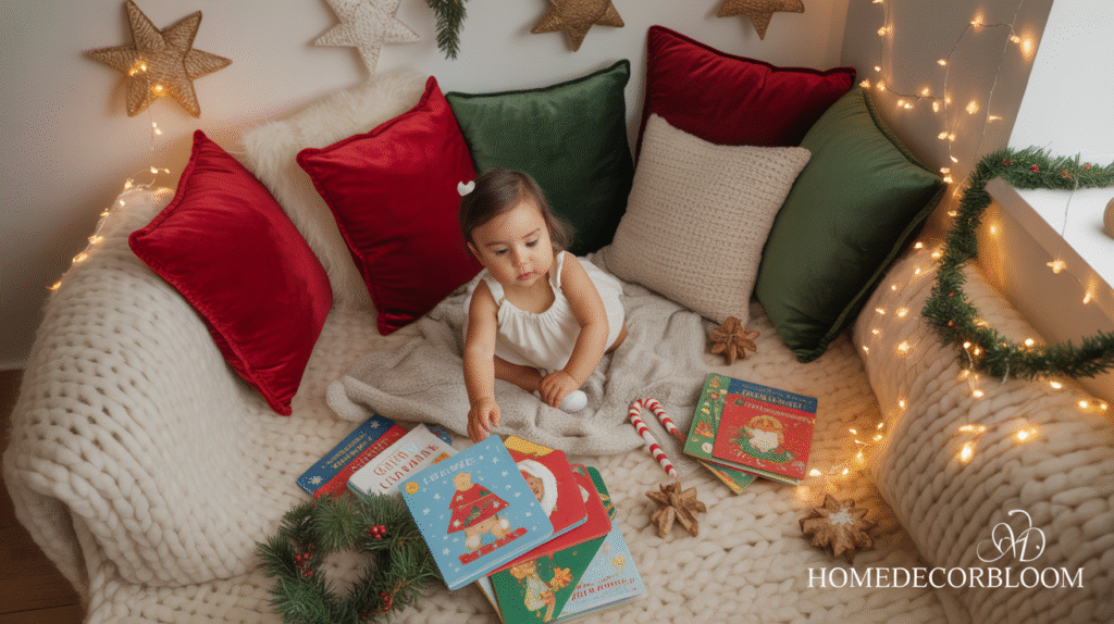 A cozy reading nook is a charming addition to your Christmas Decorations For Kids, giving them a magical little space to relax, read, and enjoy the holiday spirit. This setup doesn’t require much—just a soft blanket, a few pillows, and a small basket of Christmas books can transform a corner of their room into a festive retreat.