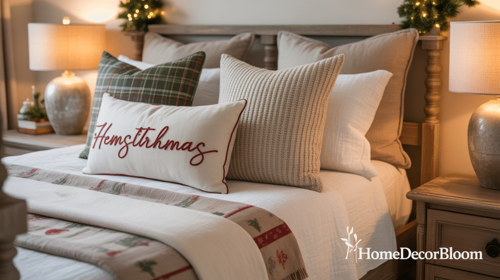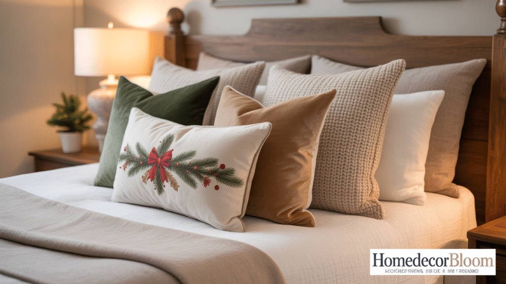 For a layered, inviting look, mix textures alongside patterns. Combine velvet, knit, or linen pillows in varying sizes to create depth and tactile appeal. This method works beautifully with rustic furniture and warm bedding, reinforcing SEO terms like textured Christmas décor, farmhouse cozy guest room, and seasonal pillow styling. Accent pillows act as both functional items for lounging and decorative pieces that instantly transform the holiday aesthetic of the room.