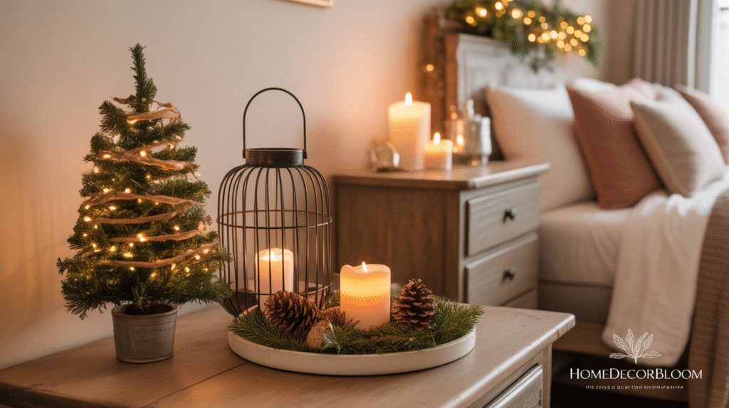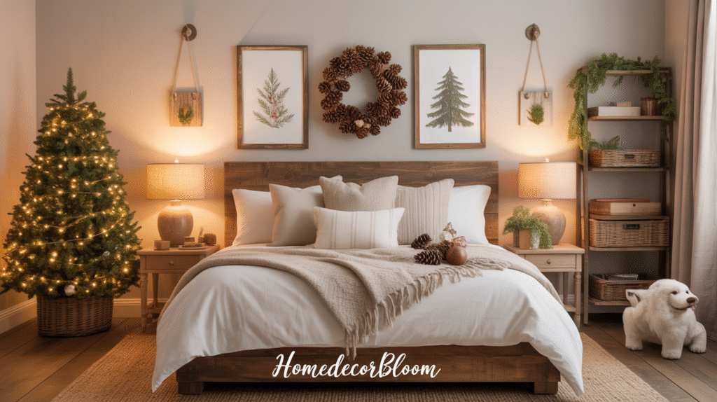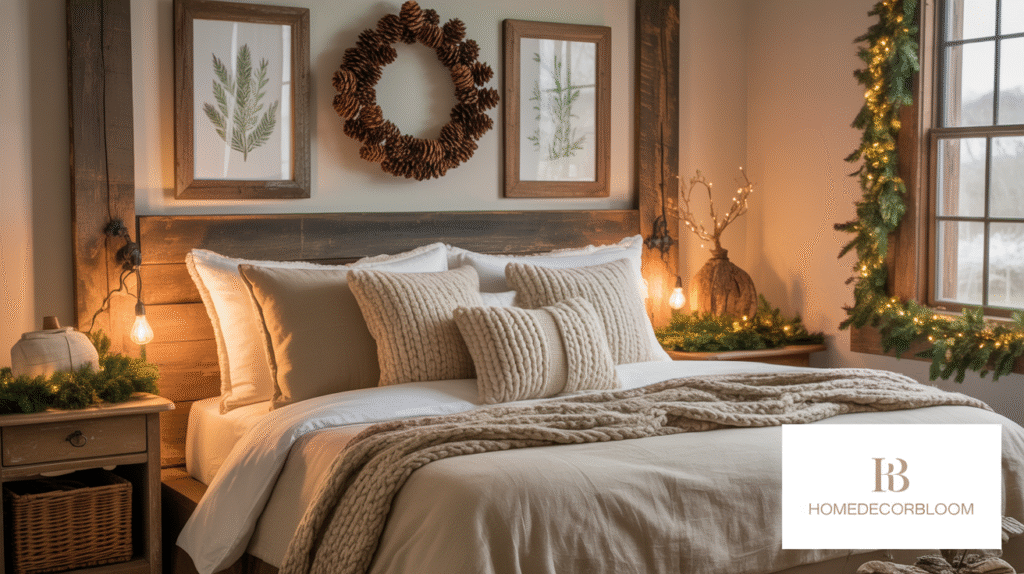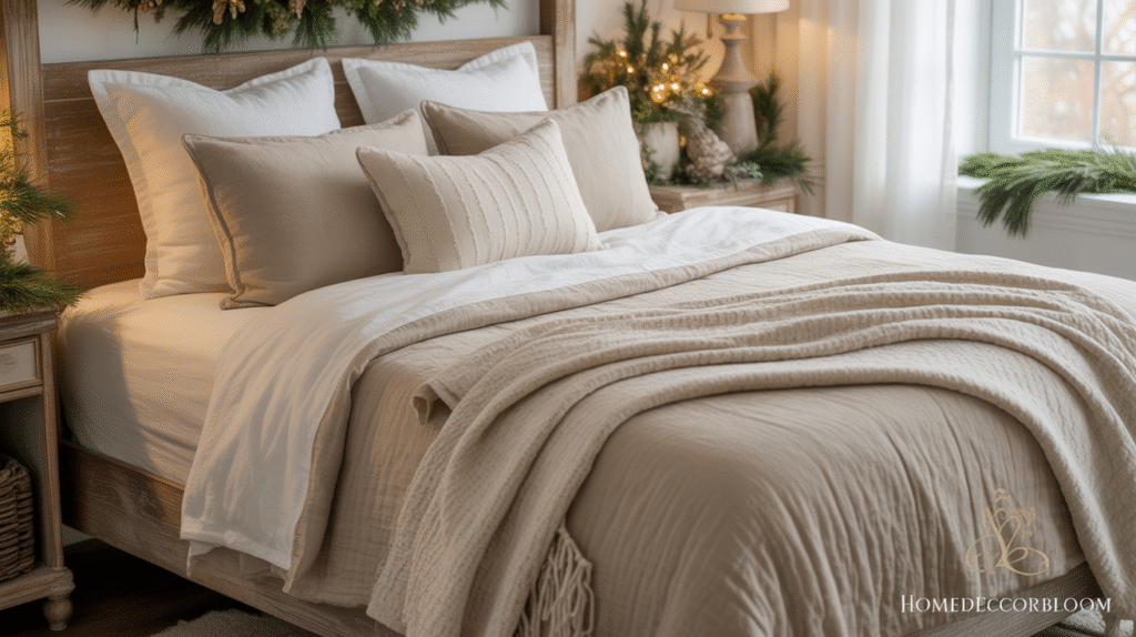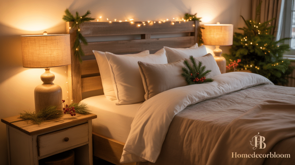 To introduce subtle Christmas charm, incorporate gentle accent lights instead of anything overly bright or flashy. Think warm fairy lights draped over a mirror, a lantern with a flameless candle, or a mini pre-lit tabletop tree positioned on the nightstand. These low-contrast lighting elements offer seasonal flair without overwhelming the room. Their softness supports semantic search intent for terms like cozy Christmas ambiance, soft festive lighting, and warm farmhouse winter decor, strengthening your blog’s overall relevancy.