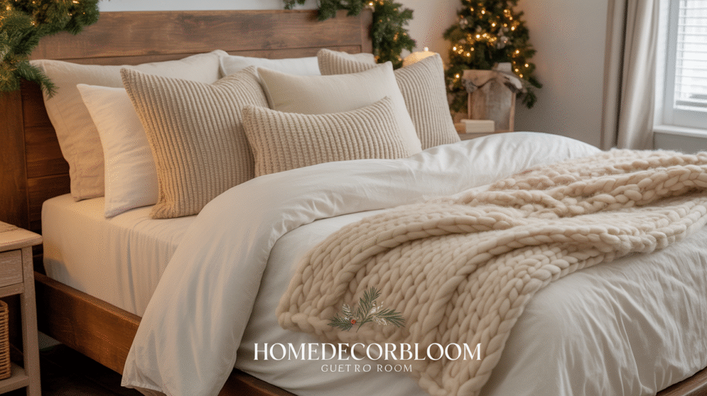 Finish the look with small, thoughtful bedding accents that make guests feel truly at home a folded throw blanket at the foot of the bed, an extra pillow basket, or even a small welcome note placed atop the quilt. These details elevate the guest experience and enhance topic relevance for phrases such as cozy guest room essentials and farmhouse holiday comfort. Together, they create a bedding setup that’s beautiful, functional, and perfectly aligned with the overall theme of your Cozy Farmhouse Christmas Guest Room.