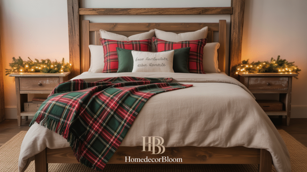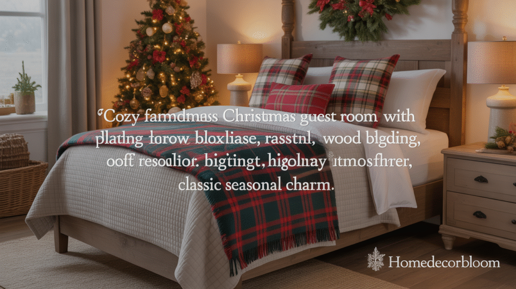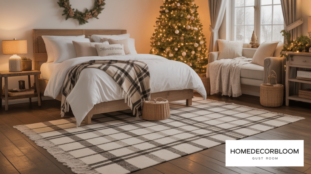 Nothing says timeless holiday comfort quite like plaid. Incorporating seasonal textiles into your Cozy Farmhouse Christmas Guest Room adds instant warmth, personality, and nostalgia. Plaid throws, flannel pillows, or a tartan blanket at the foot of the bed introduce subtle festive color while still blending beautifully with the room’s neutral farmhouse palette. These additions support strong LSI/NLP keywords such as plaid Christmas bedding, seasonal farmhouse textiles, and cozy holiday fabrics, helping enhance search relevance and user engagement.
