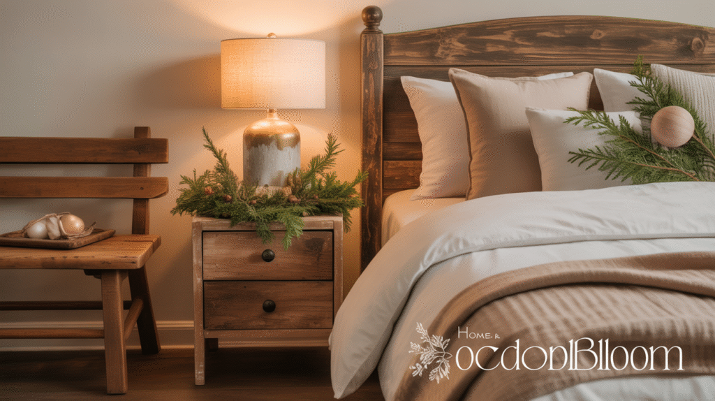 Incorporate small seasonal accents that reflect the room’s overall rustic and cozy theme. A tiny ornament, a sprig of pine tied with twine, or a framed family photo in a farmhouse-style frame adds warmth without cluttering the space. These subtle decorations support semantic search intent for terms like festive guest room details, warm holiday environment, and farmhouse Christmas décor ideas, reinforcing the cozy and welcoming narrative of your blog.