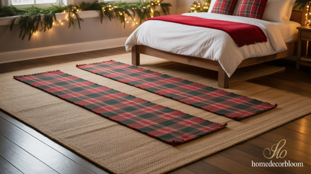Layering rugs can further amplify the cozy feel — for instance, place a small faux-fur or woven rug atop a neutral jute or sisal base rug. This layering technique adds dimension, tactile interest, and visual warmth, aligning with search-friendly phrases like layered holiday décor, rustic winter textures, and cozy guest room styling. Seasonal rugs also help define different areas within the guest room, such as a reading corner or bedside zone, subtly guiding movement and enhancing comfort.