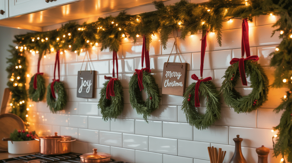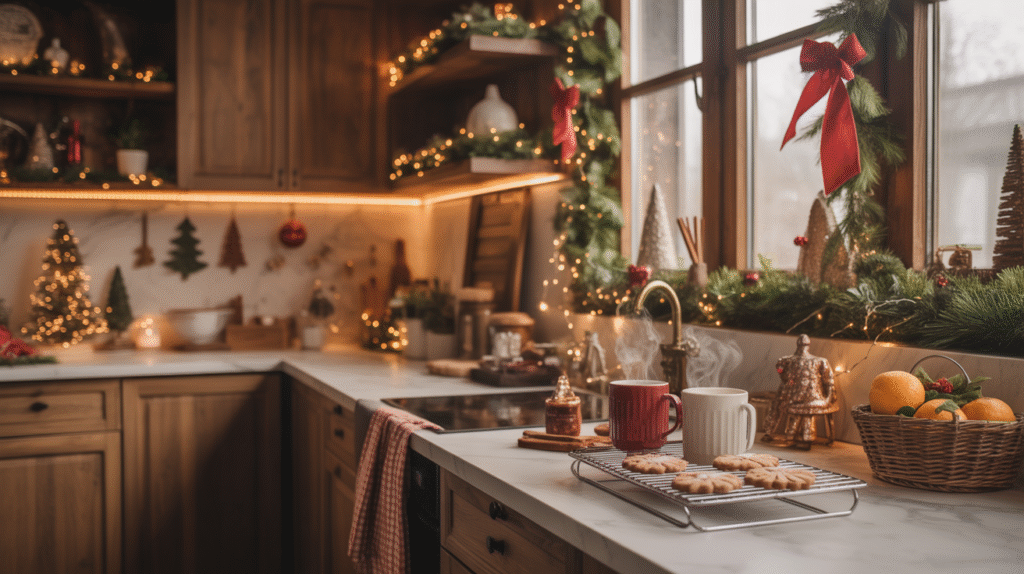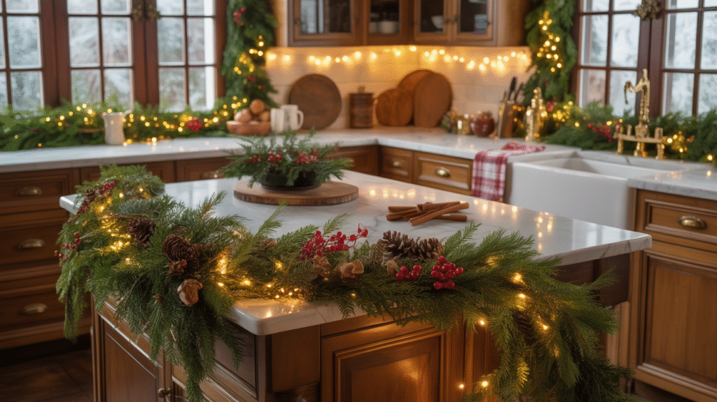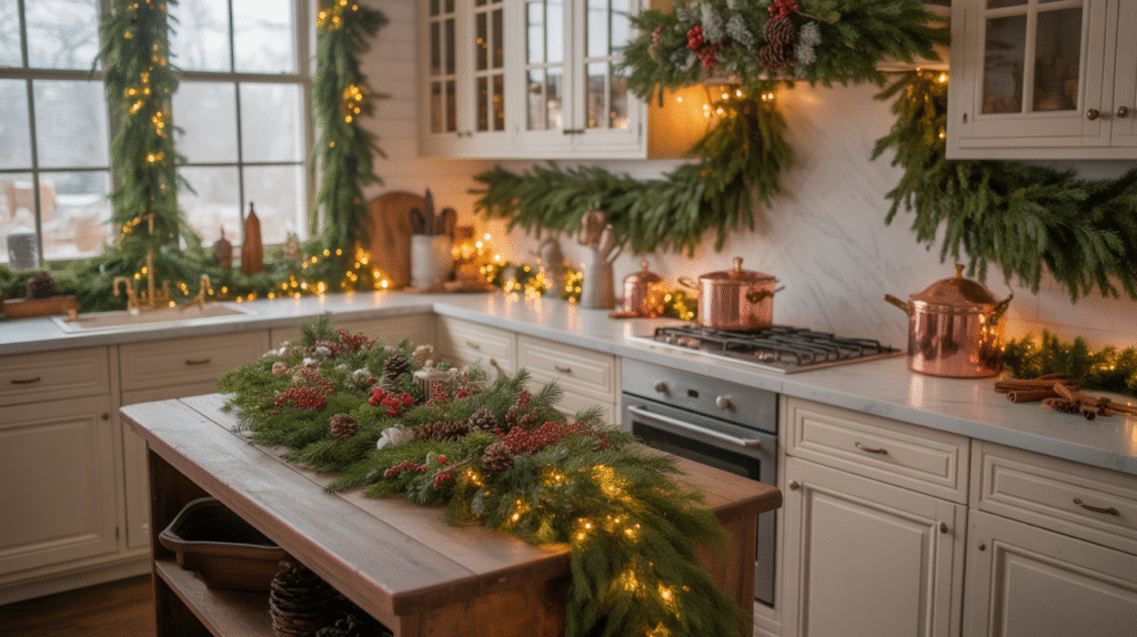 Fresh or faux garlands with subtle lights, berries, or pinecones create a cozy and inviting atmosphere. Their soft, earthy tones balance perfectly with the warmth of kitchen lighting, elevating the overall feel of your Cozy Christmas Kitchen Decor without overwhelming the space. They help soften hard lines and add a gentle, festive glow.