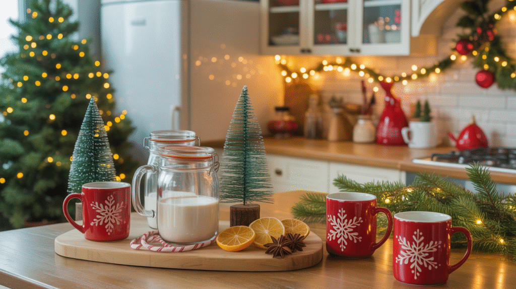 A themed drink station doesn’t need to take up much space—just a tray, a corner shelf, or a section of your countertop. Adding mini trees, gingerbread accents, or a small garland makes the setup feel warm and inviting. These decorative touches elevate your Cozy Christmas Kitchen Decor while supporting keywords like seasonal kitchen decorations, cozy seasonal touches, and holiday kitchen atmosphere, all beneficial for high-ranking content.