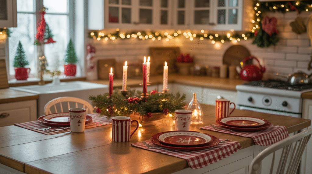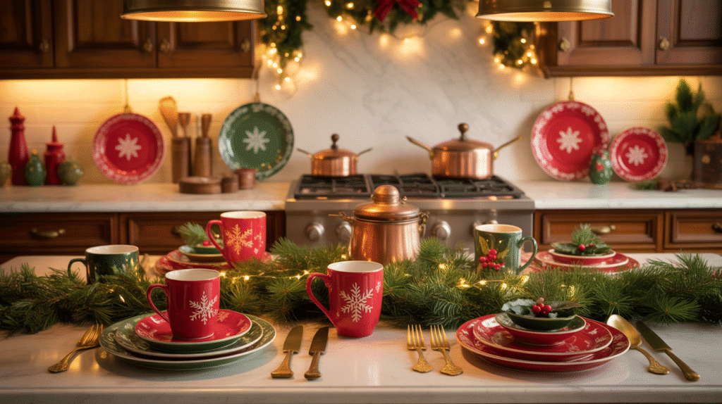 For a more curated look, coordinate your dishware with matching napkins, chargers, or serving trays. This creates visual harmony and enhances the festive feel of your kitchen. These thoughtful touches elevate your Cozy Christmas Kitchen Decor while integrating LSI phrases like festive home décor ideas, kitchen holiday inspiration, and Christmas home decorating ideas for maximum search visibility.