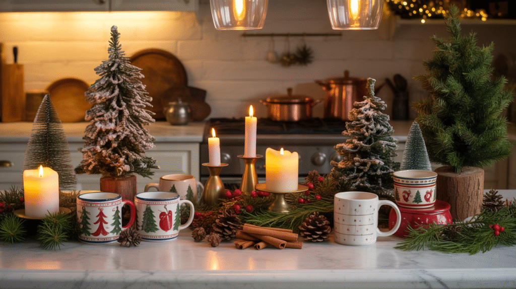 To elevate the design further, add decorative trays, mini lanterns, or ceramic Christmas houses. These items bring depth, height, and texture to your arrangement, making it visually appealing from every angle. This approach enhances your Cozy Christmas Kitchen Decor while supporting additional LSI terms like festive kitchen styling, kitchen holiday inspiration, and Christmas home decorating ideas for stronger keyword optimization.