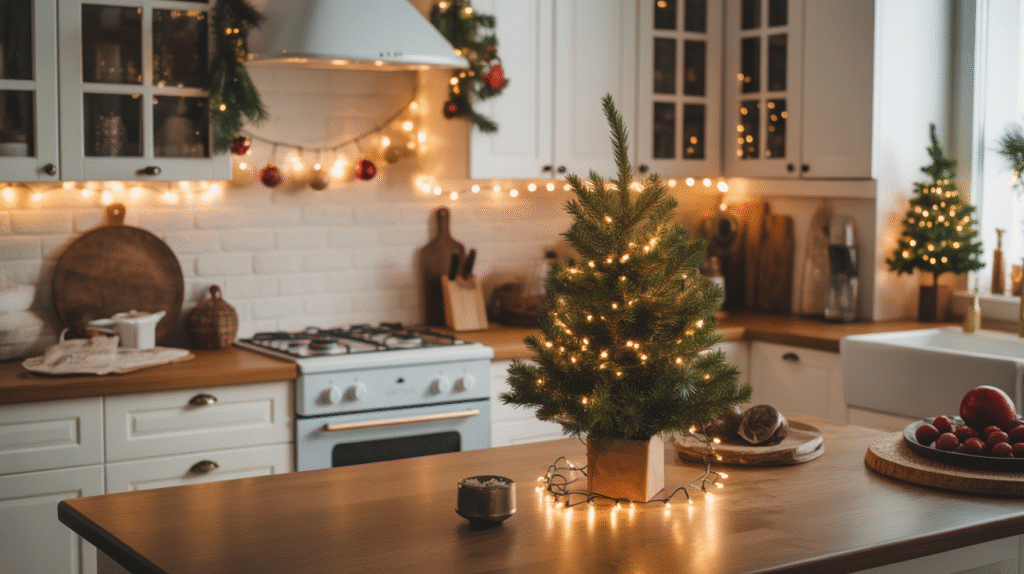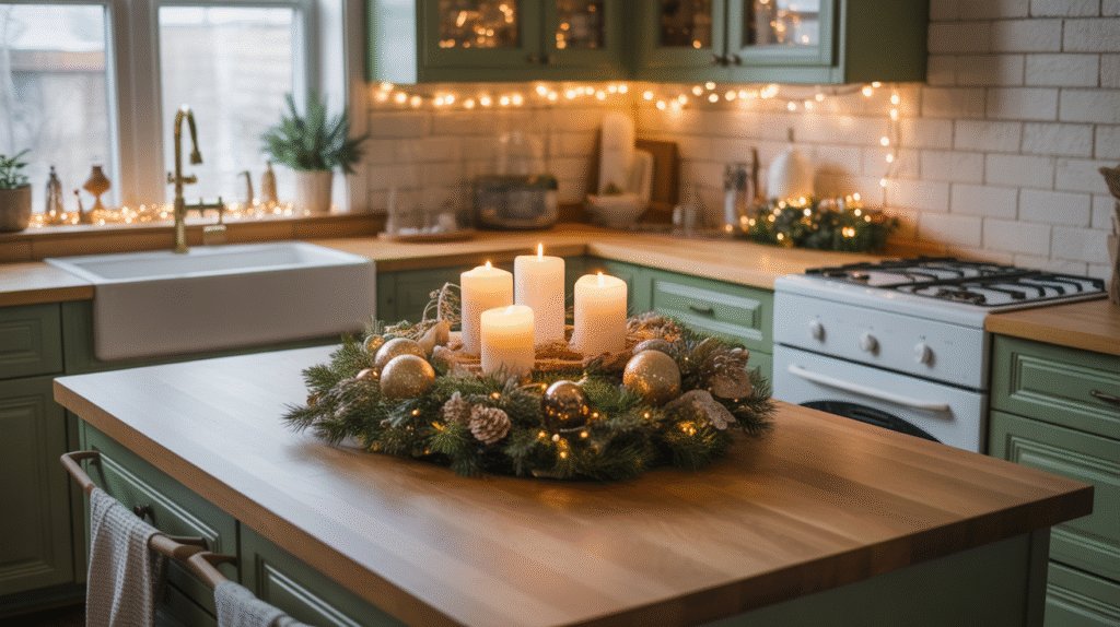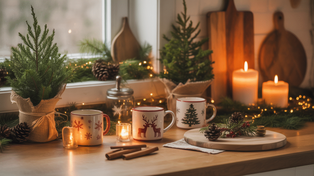 Decorating your countertops with simple, festive accents is a beautiful way to elevate your kitchen for the season. A curated display of candles, mini trees, wooden boards, or holiday mugs can instantly create charm. These little arrangements help set the tone of your Cozy Christmas Kitchen Decor and make your kitchen feel warm and welcoming.