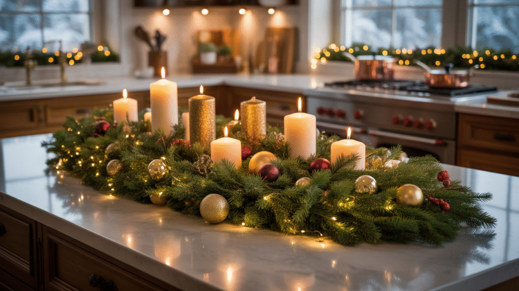 Greenery instantly brings life and seasonal charm to your kitchen, making it feel warm and festive. Draping garlands over cabinets, windows, or open shelves adds natural texture that enhances the beauty of your Cozy Christmas Kitchen Decor. Even a small strand of greenery can make the entire space feel more connected to the holiday spirit.