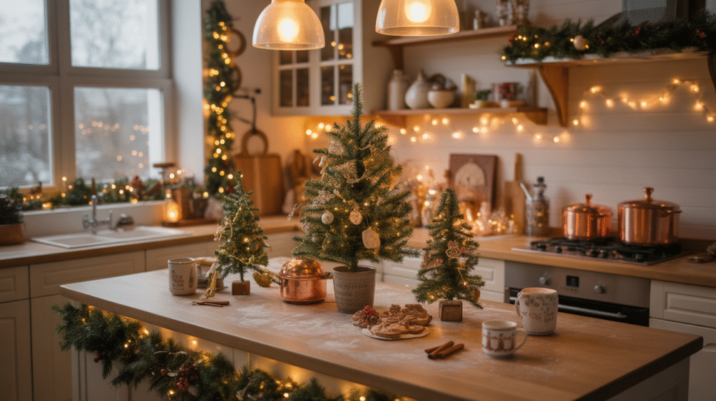 Mini trees add height, texture, and charm to your kitchen without overwhelming the space. Whether flocked, natural, or decorated with tiny ornaments, they blend beautifully with your Cozy Christmas Kitchen Decor. Their presence helps reinforce important SEO-friendly phrases such as holiday kitchen atmosphere, cozy seasonal touches, and Christmas cooking space décor, improving content relevance and search visibility.