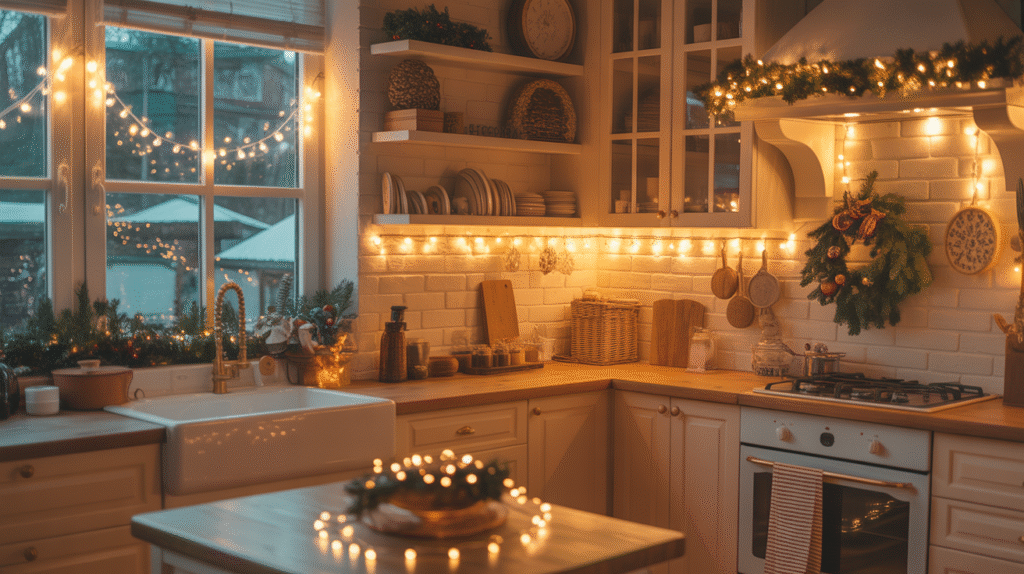 Ambient lighting adds depth and creates a relaxing holiday atmosphere. String lights around windows, shelves, or garlands illuminate the room in a subtle, inviting way. This cozy brightness blends beautifully with your Cozy Christmas Kitchen Decor, reinforcing LSI-rich phrases such as holiday kitchen atmosphere, cozy seasonal touches, and Christmas cooking space décor for improved search visibility.