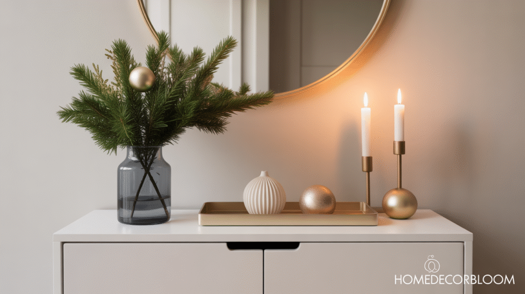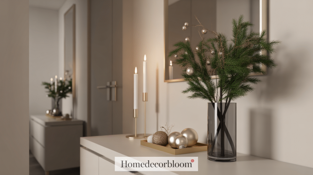Incorporating layers of height—such as placing a taller candle or vase alongside shorter ornaments—adds depth while keeping the design uncluttered. A thoughtfully styled console table elevates your Minimalist Christmas Hallway Decoration, making the entryway feel inviting, serene, and refined for the festive season.