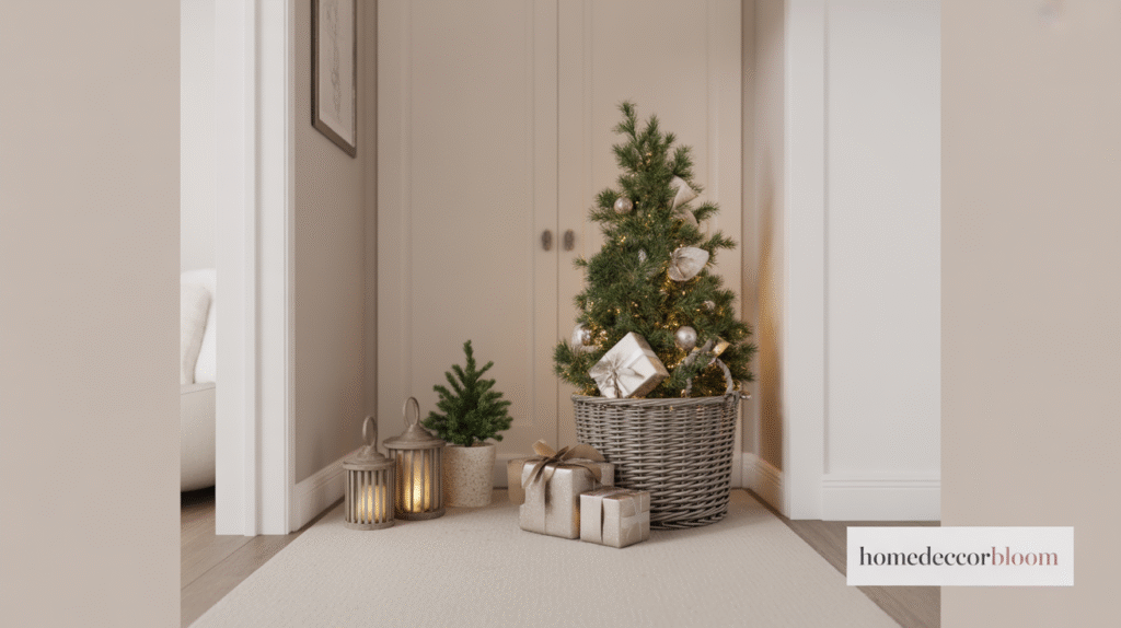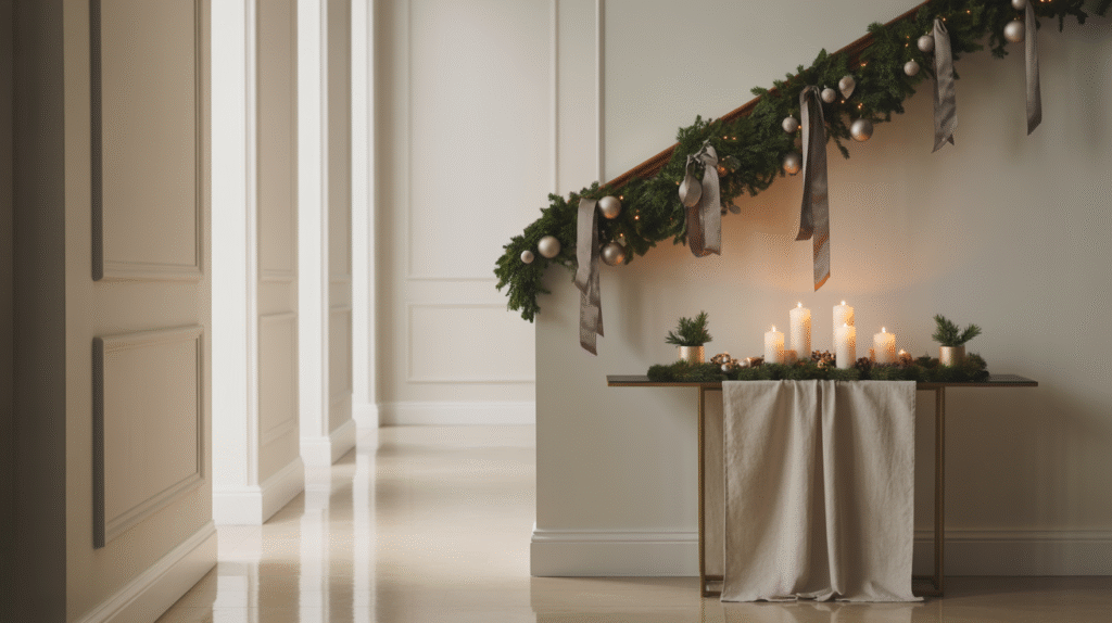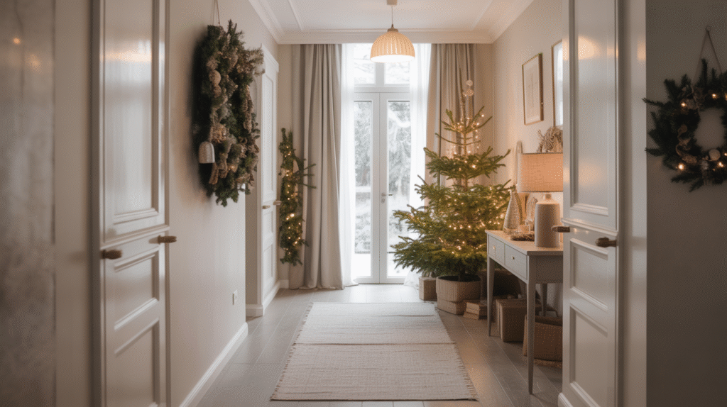 Layering textures, such as a linen runner, a soft rug, or woven baskets, adds depth without adding visual clutter. This combination of neutral tones and textures helps maintain a Minimalist Christmas Hallway Decoration that feels elegant, inviting, and effortlessly festive.