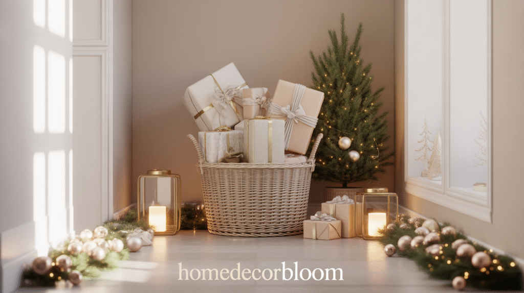 Incorporating minimalist floor décor is a subtle yet effective way to complete your Minimalist Christmas Hallway Decoration Ideas. Consider placing a simple basket with wrapped faux presents, a few neutral-toned lanterns, or a small evergreen arrangement near the entryway or along the hallway. These elements add holiday charm while keeping the floor space uncluttered and open.