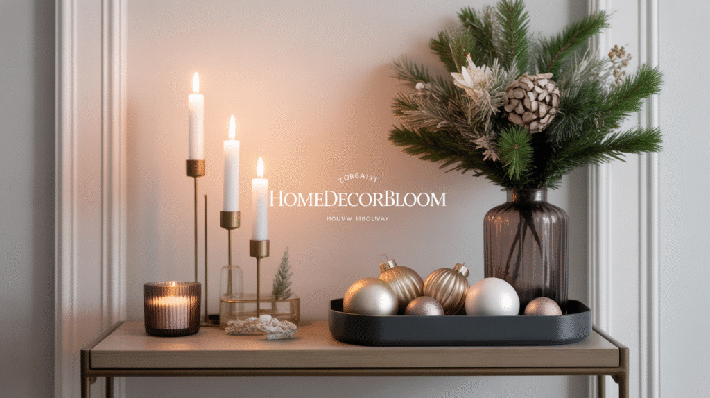 Stick to neutral tones, soft metallics, or muted holiday colors to maintain the modern holiday hallway décor aesthetic. Avoid overloading the surface with too many items; instead, focus on a few curated pieces to achieve visual balance. Layering height with items like tall candles or a small stacked ornament arrangement adds dimension while preserving simplicity.