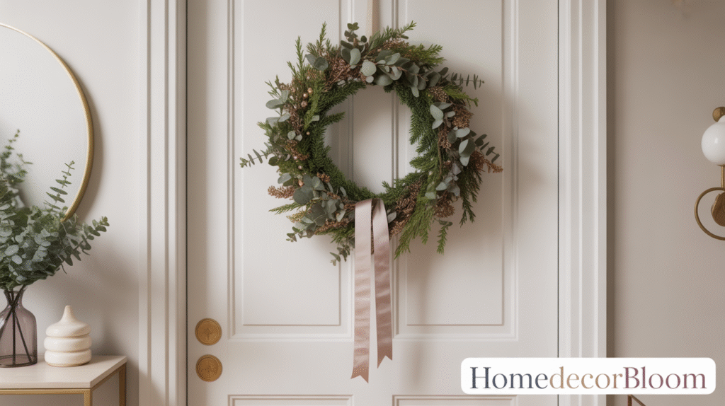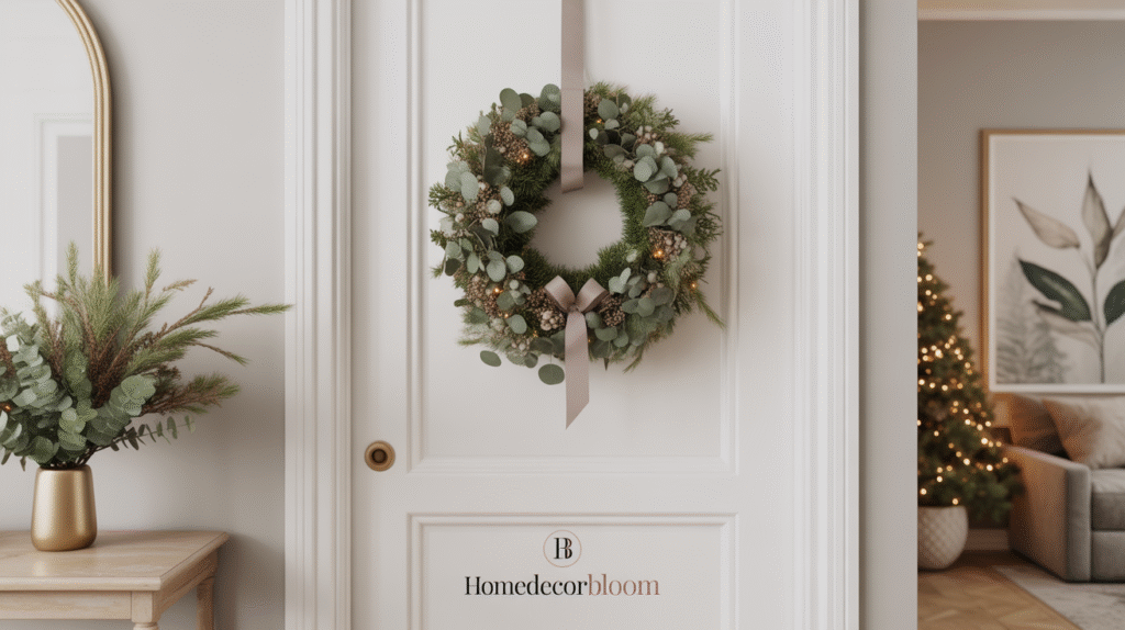 A minimalist wreath is a perfect focal point for your Minimalist Christmas Hallway Decoration Ideas. Instead of heavy, ornate wreaths, choose simple designs with greenery, eucalyptus, or subtle metallic accents. A wreath hung on the front door, interior door, or above a console table can provide an instant festive touch while keeping the space airy and uncluttered.