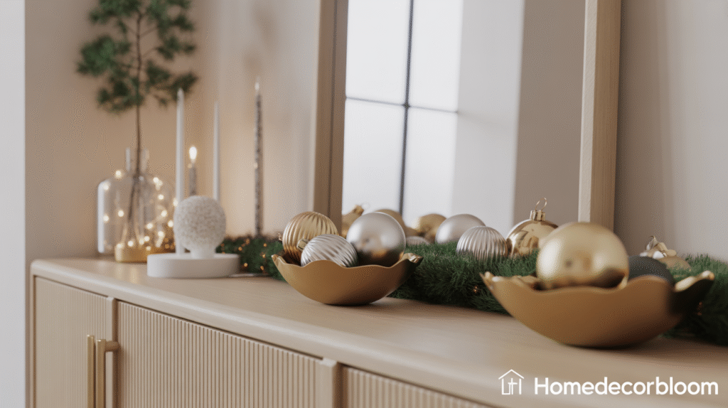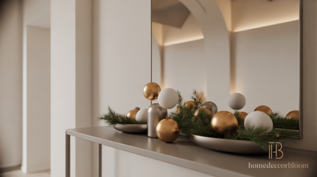 You can also create small clusters of ornaments on trays or in glass jars to introduce texture and depth without overpowering the space. Thoughtful placement of minimalist ornaments ensures your Minimalist Christmas Hallway Decoration feels stylish, serene, and subtly festive.