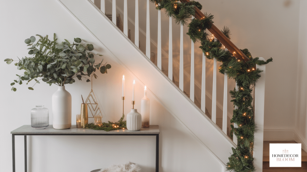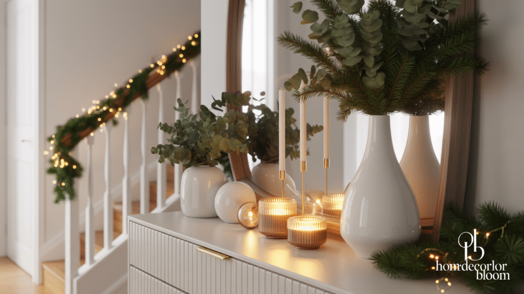 For a minimalist look, pair greenery with neutral or metallic elements such as white vases, gold candle holders, or sleek glass jars. Avoid over-accessorizing; the goal is to highlight the beauty of each element while maintaining open space and a clean aesthetic. This approach reinforces modern holiday hallway décor and ensures your entryway feels airy, welcoming, and sophisticated.