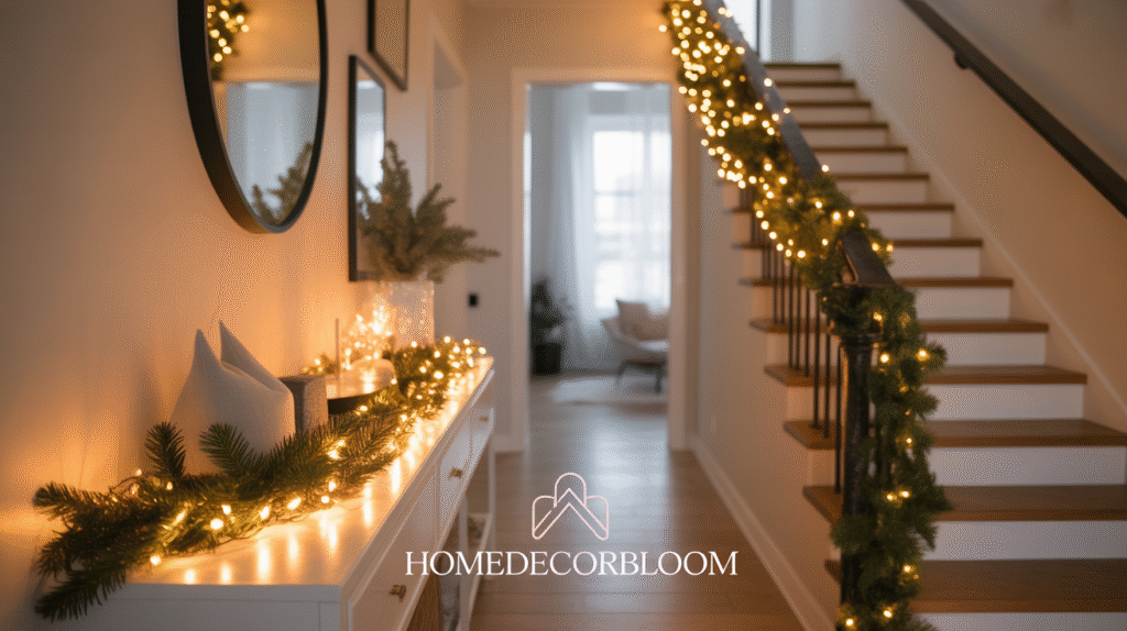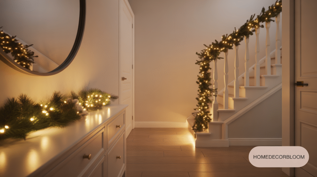For a cohesive look, choose warm white or soft golden lights and avoid overly colorful or flashing designs. Pairing the lights with simple greenery, neutral décor items, or metallic accents enhances the modern holiday hallway décor while keeping the space serene and elegant. The gentle glow creates a welcoming atmosphere that subtly signals the festive season.