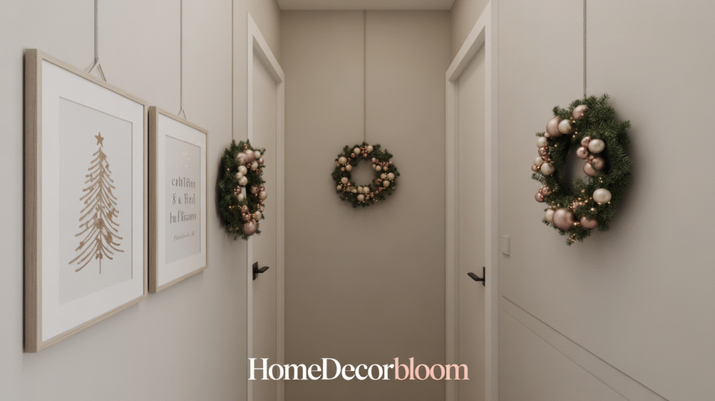 Adding subtle wall décor can enhance your Minimalist Christmas Hallway Decoration Ideas without overcrowding the space. Consider simple framed prints with holiday motifs, small wreaths, or minimal garlands hung neatly along the wall. These understated accents add visual interest while maintaining a clean and airy aesthetic.
