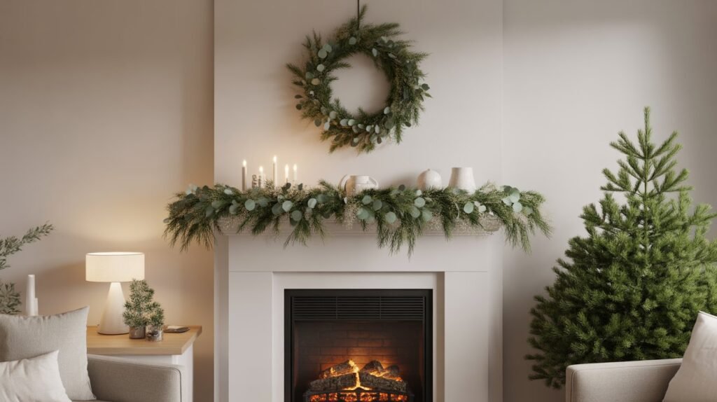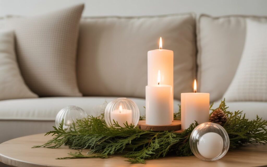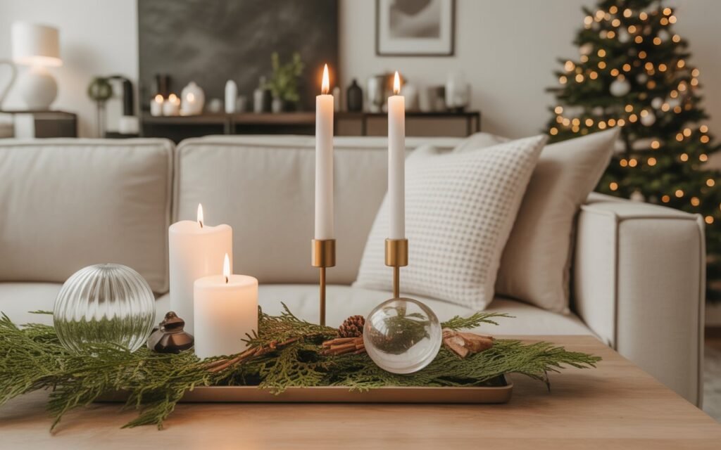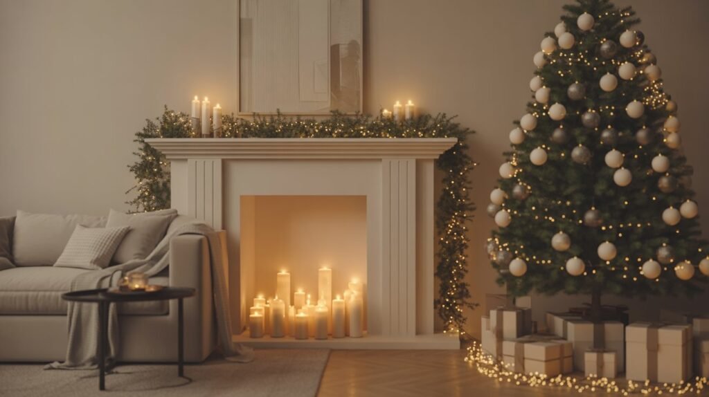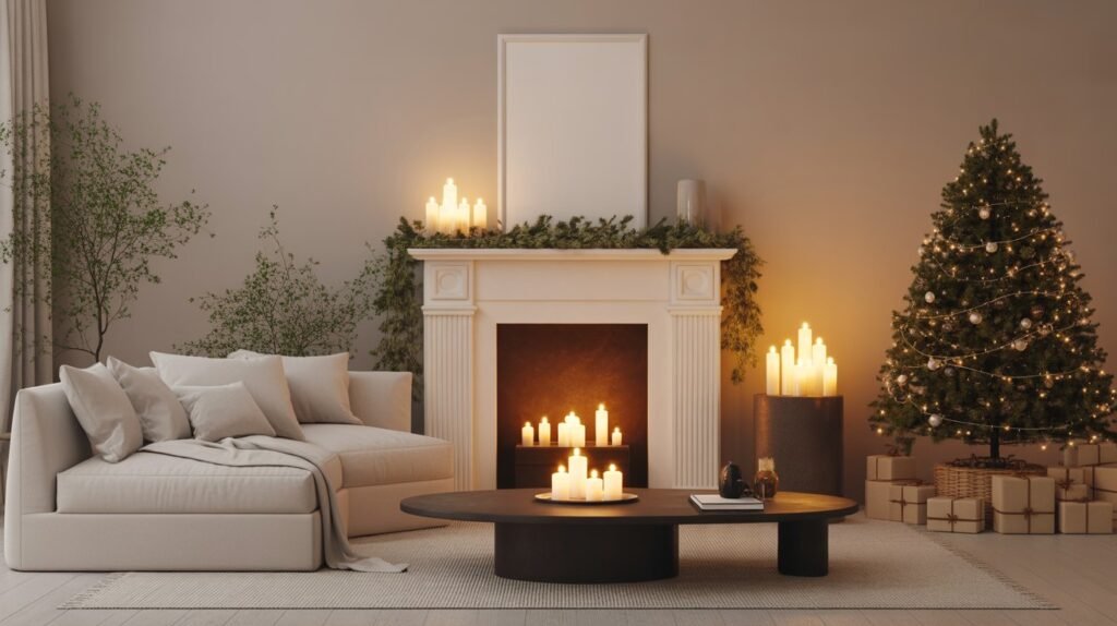 Arrange them in small clusters on your coffee table, mantel, or console for an ambient glow that replaces the need for excessive lighting. Mixing heights creates depth while keeping the visual flow uncluttered. The flickering candlelight will instantly make your living room feel cozy, festive, and tranquil — a hallmark of minimalist Christmas charm.