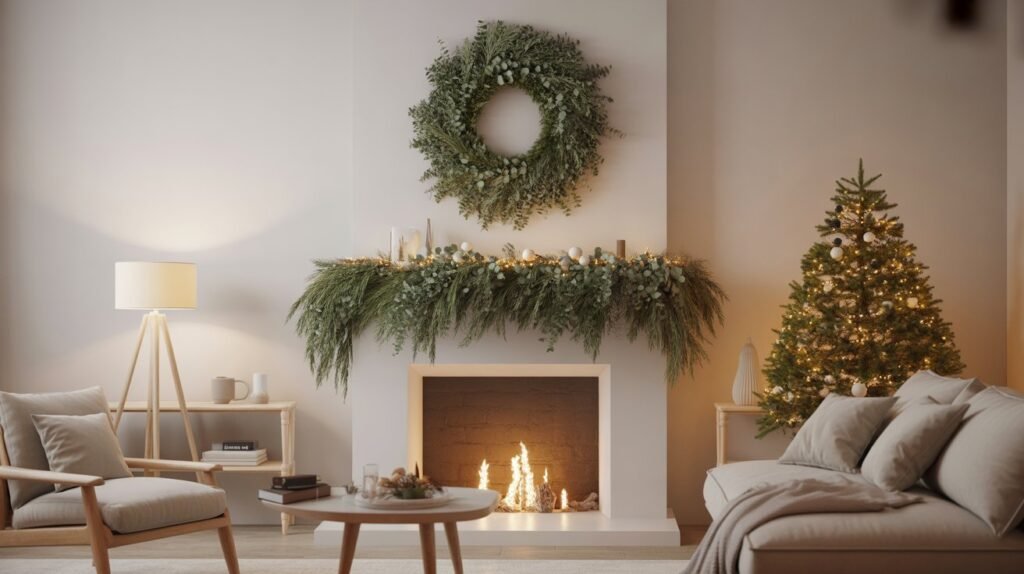 Hang your wreath above the sofa, fireplace, or even in a large window for a balanced focal point. If using a garland, drape it softly across your mantel or around the doorway for a gentle festive touch. Minimalist wreaths crafted from dried florals or woven wood are also trending in 2025 — blending nature with timeless design.