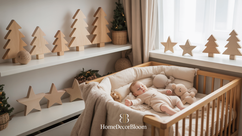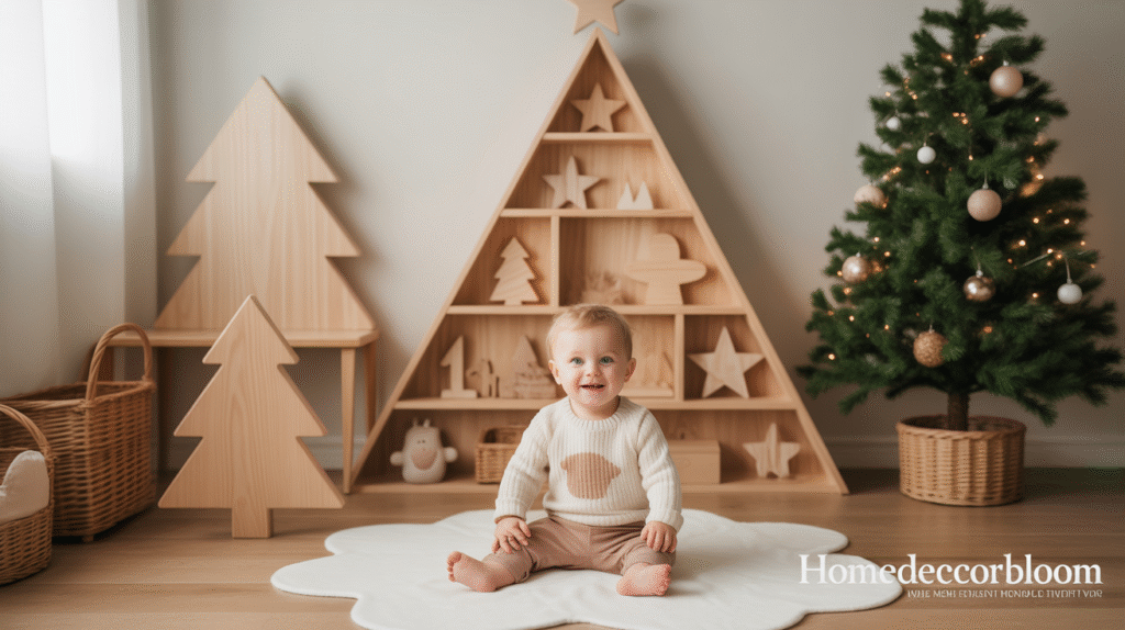 Wooden elements are a signature feature of Minimal Christmas Room Decor for Kids, bringing warmth and authenticity to the space. Natural wood tones instantly add a Nordic charm that feels both rustic and refined. Incorporating wooden Christmas trees, stars, figurines, or small décor pieces helps maintain a clean and grounded aesthetic while introducing festive joy in a subtle and timeless way.