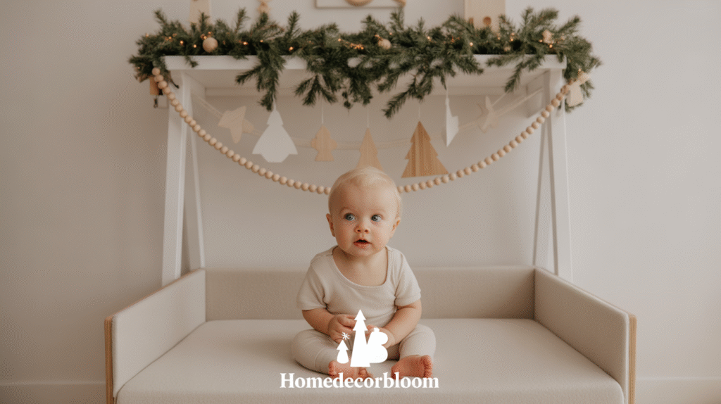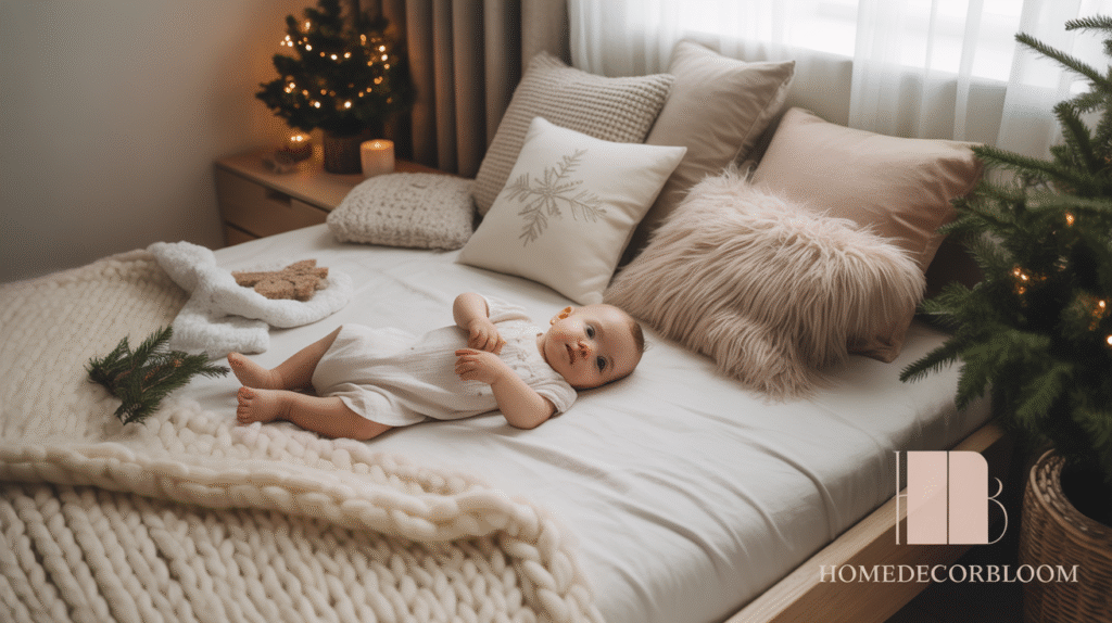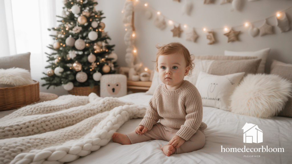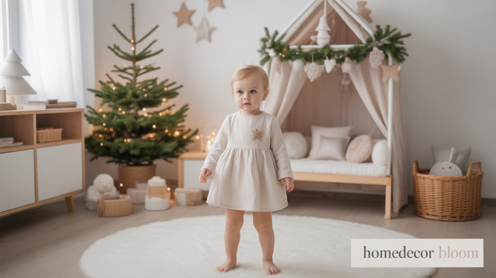 This gentle color approach supports a peaceful atmosphere ideal for rest, play, and creativity. Whether you add soft knitted blankets, mini Christmas trees, or subtle star accents, a neutral theme ensures that the room feels festive yet serene. It’s a perfect blend of Nordic charm and child-friendly comfort.