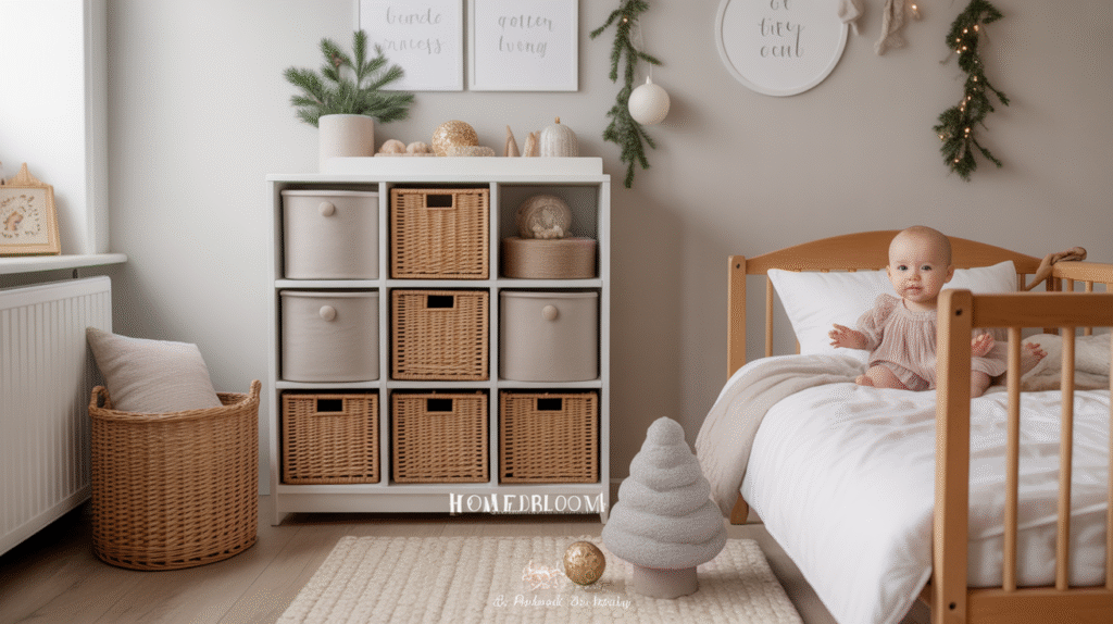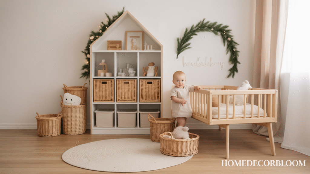 Functional storage is key to maintaining the clean and airy feel of Minimal Christmas Room Decor for Kids. Nordic design values organization, simplicity, and intentional styling—making storage solutions an important part of the overall aesthetic. Baskets, wooden crates, and neutral-toned bins help keep toys and holiday items tidy while adding warmth to the room.